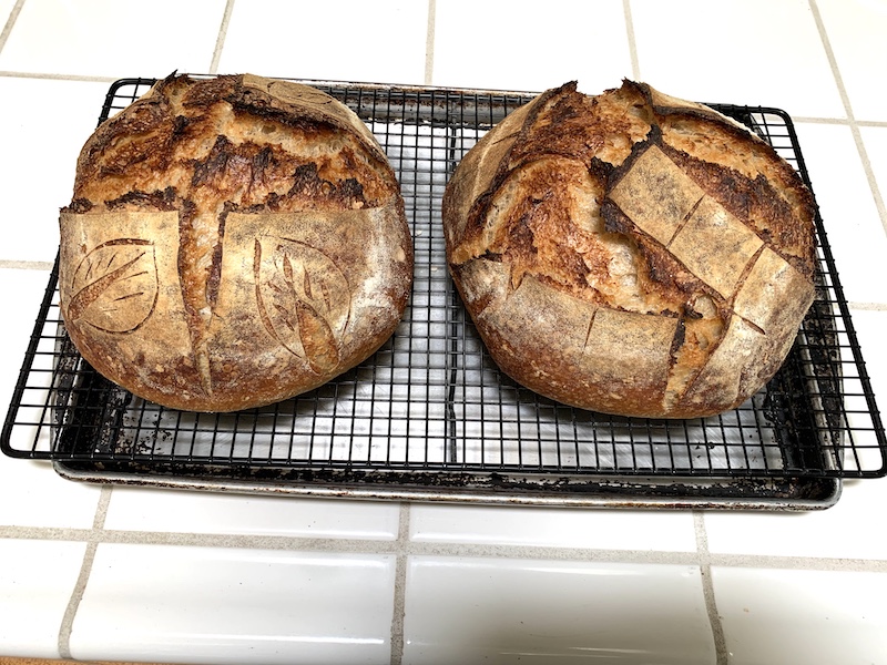 12. Bake in cast iron Dutch ovens covered at 475ºF for 30 minutes, then uncovered for another 20 minutes at 460. Alternatively, pre-heat your oven to 500ºF for an hour with a baking stone and steaming apparatus in place. Turn down the oven to 460ºF. Bake with steam for 15 minutes. Remove the steaming apparatus. Continue to bake for another 30-35 minutes. (Note: My preferred method, after I remove my steaming apparatus, is to bake at 440ºF with the convection fan turned on.)
