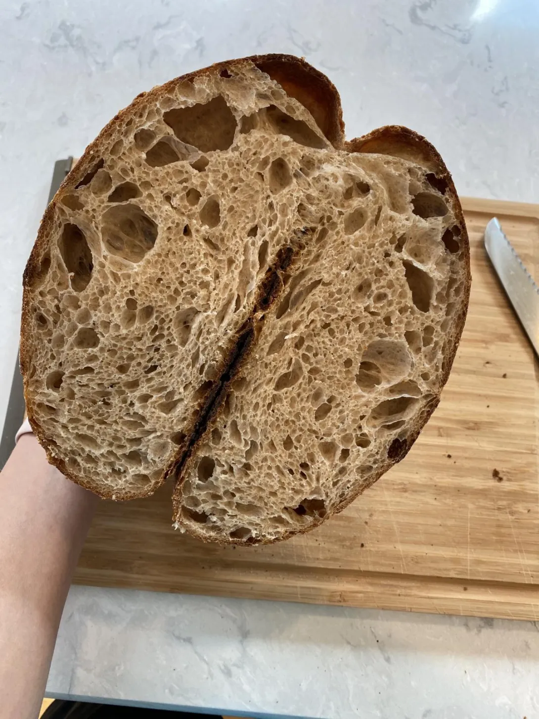 -This is the recipe I've been using (I add 325 g. water verus the 350 in the recipe to make it easier to handle). Brands of flour I use are Bob's Red Mill Whole Wheat and KAF Bread: https://www.abeautifulplate.com/artisan-sourdough-bread-recipe/