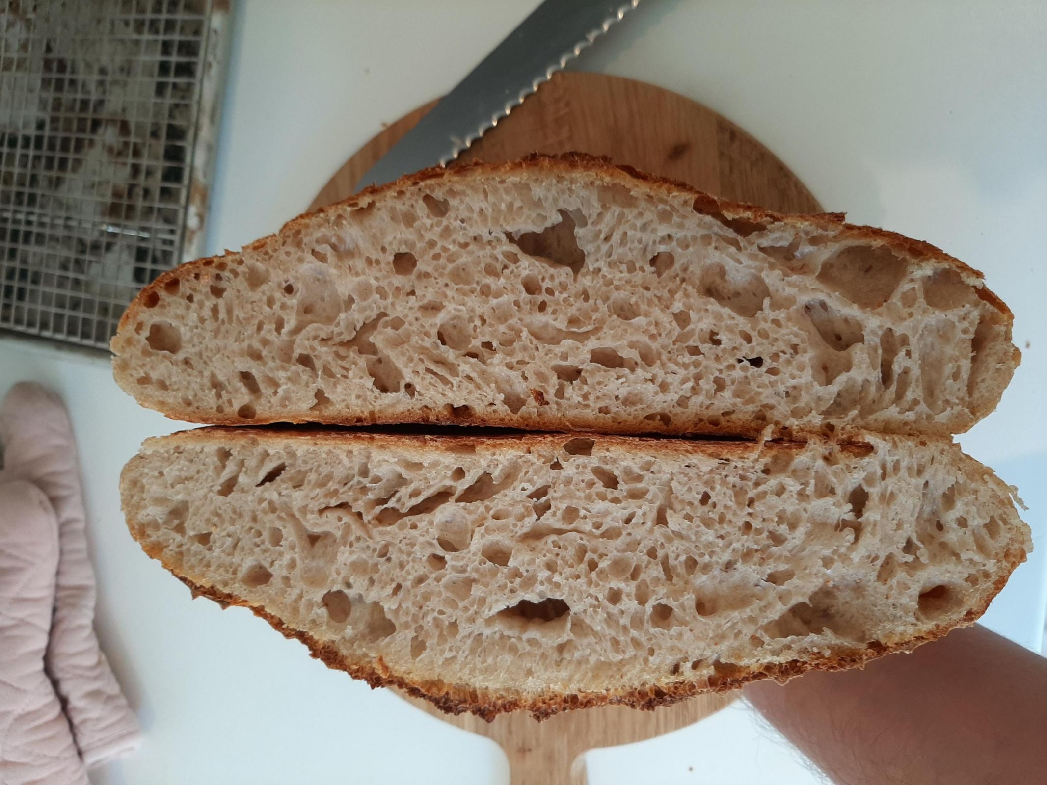 The crust is not as crunchy as it usually is, which is to be expected as well. However, the crumb doesn't look nearly as overproofed as I thought it would.