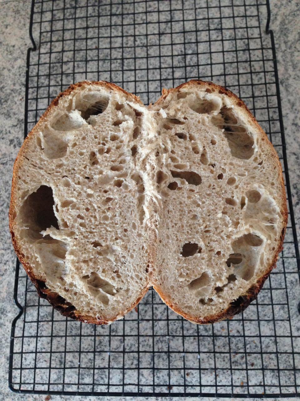 Autolyse, rest 4 hours. Levain, mix 3 min and rest 30 min. Salt, mix 3 min and rest 30 min. Strong fold, rest 30 min. Strong fold, rest 30 min. Lamination, rest 45 min. Coil fold 1, rest 45 min. Coil fold 2, rest 45 min. Coil fold 2, rest the remaining of the bulk. Preshape, rest 20 min. Shape, rest 20 min. Chilled for 9 hours in the fridge. Baked in a homemade pizza stone with steam (lava rocks)