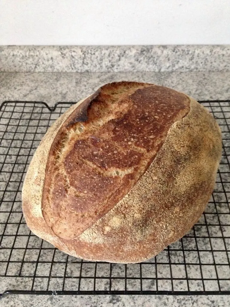 My first loaf was pretty decent but oven spring didn't let me satisfied. It was baked in a dutch oven, straight from the fridge to the oven. At 250º C, 20 min and 220ºC, 20 min. This was the procedure: