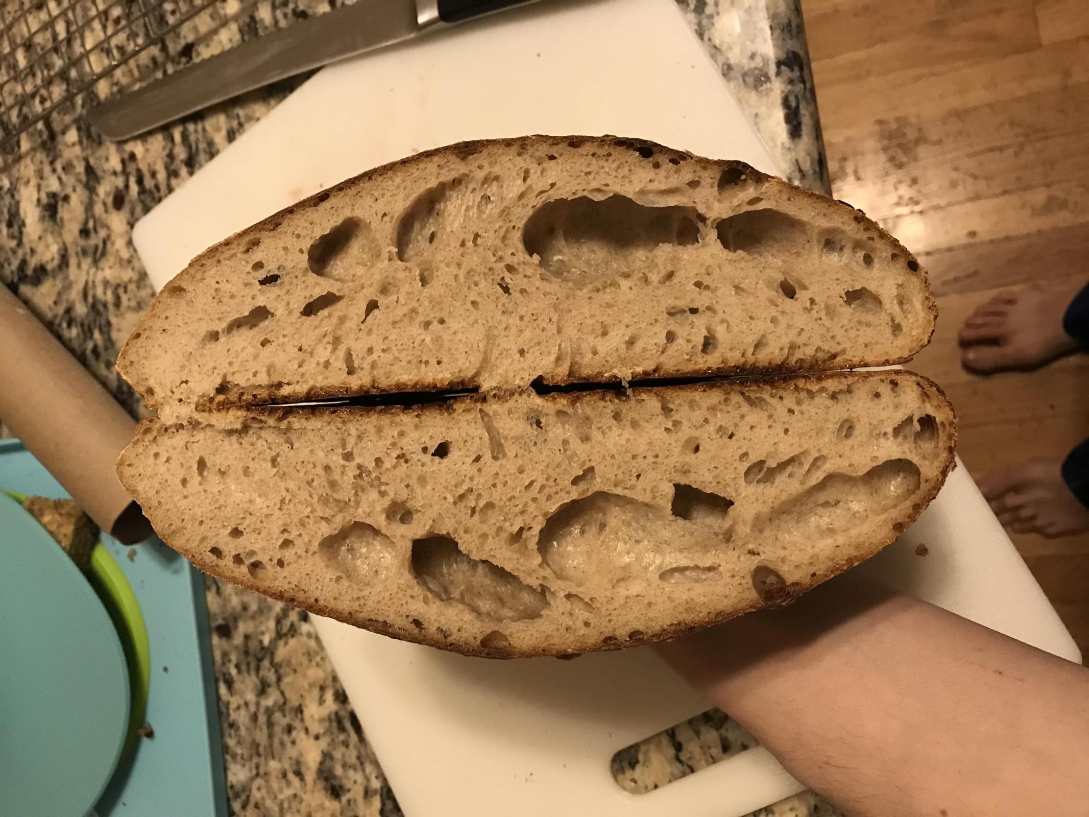 Flat loaf, big air pockets, bread not breaking through score