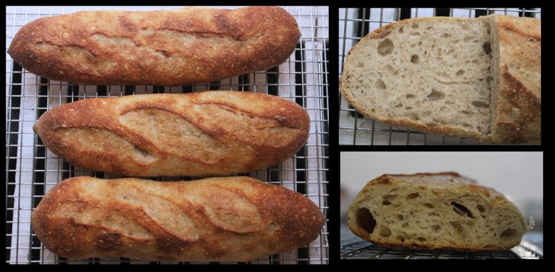 Jus about everything is on track, and you can see for yourself how a "low" hydration dough can yield an open crumb with the right feel for the dough at the divide/pre-shape and shape steps. Improvements in shape, scoring and crumb are all on display here.