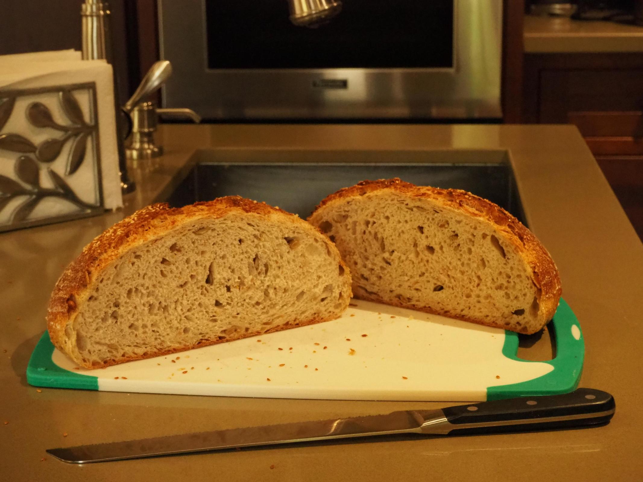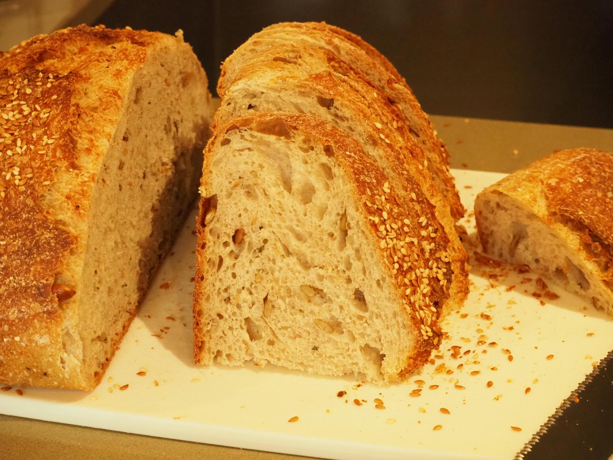 Soft crumb and crust. Nice mild taste - but a bit bland. Would use more whole wheat next time but ran out. I used 20% seeds but could have added more. Loaf was large, so it could have been made into two batards instead. I preshaped but then left it as the dough was stiff. I could have upped the hydration another 10% too.