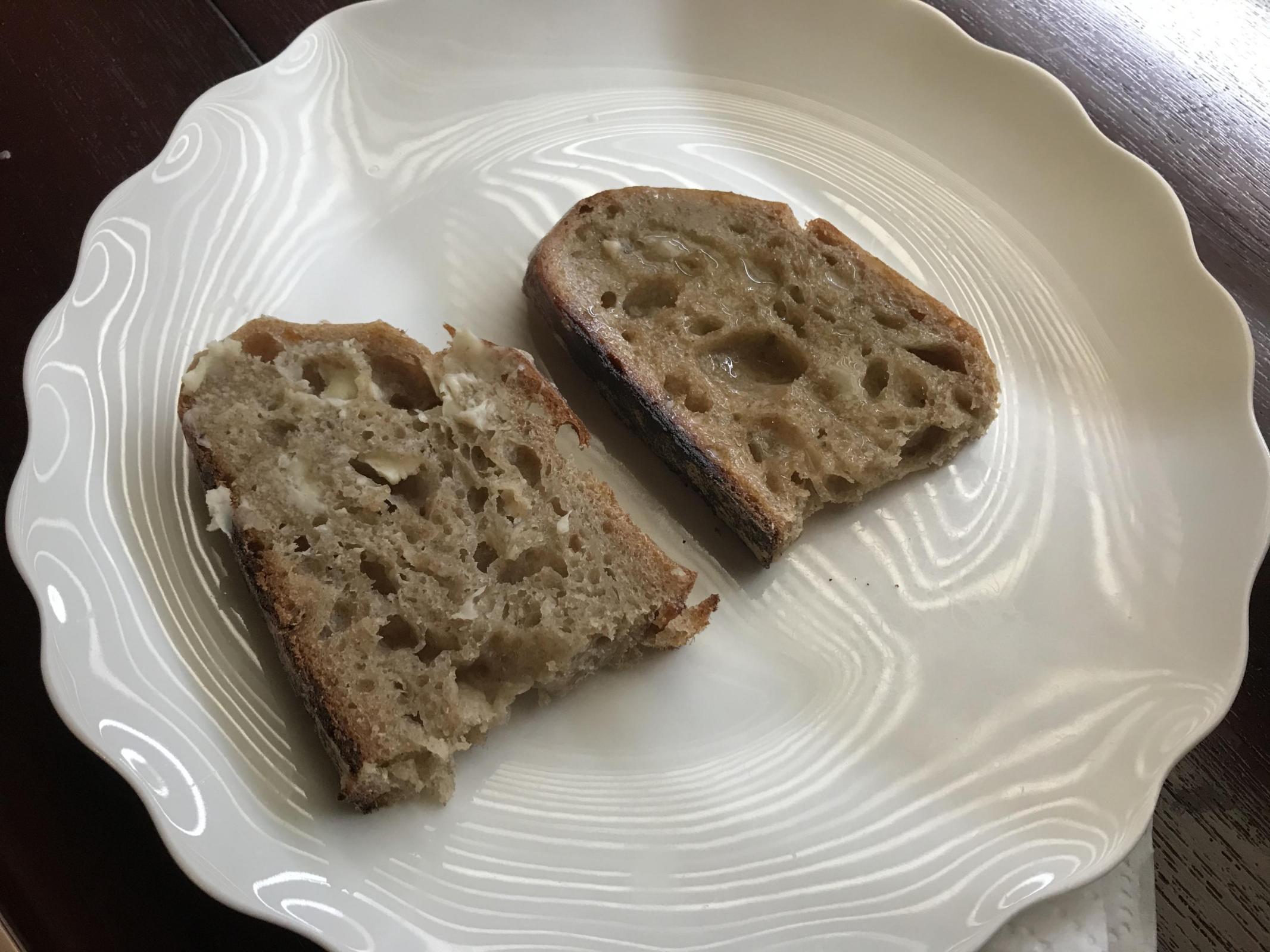 Moist but obviously done, yummy, mild, pleasant tang. I can see the air pockets have gelatinized (I hear this is a good thing) and overall I am impressed that I managed this little boule. I eat it plain and as toast.