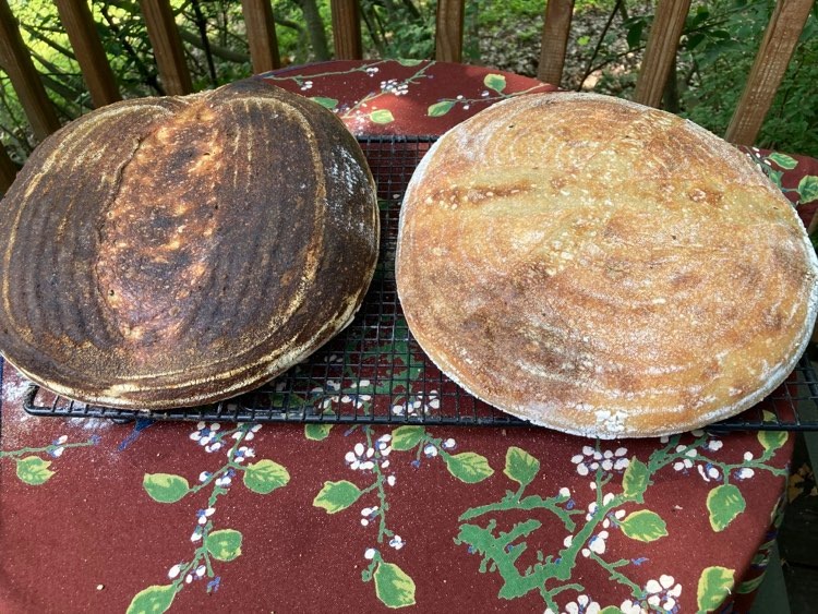 I think I slashed them too deep as they went out instead of up, but they are delicious and the crumb looks perfect to me. This is very high hydration, so I haven't gotten the slashing perfected, but the bread is pretty good for the grill - at least the best of three I've gotten so far.