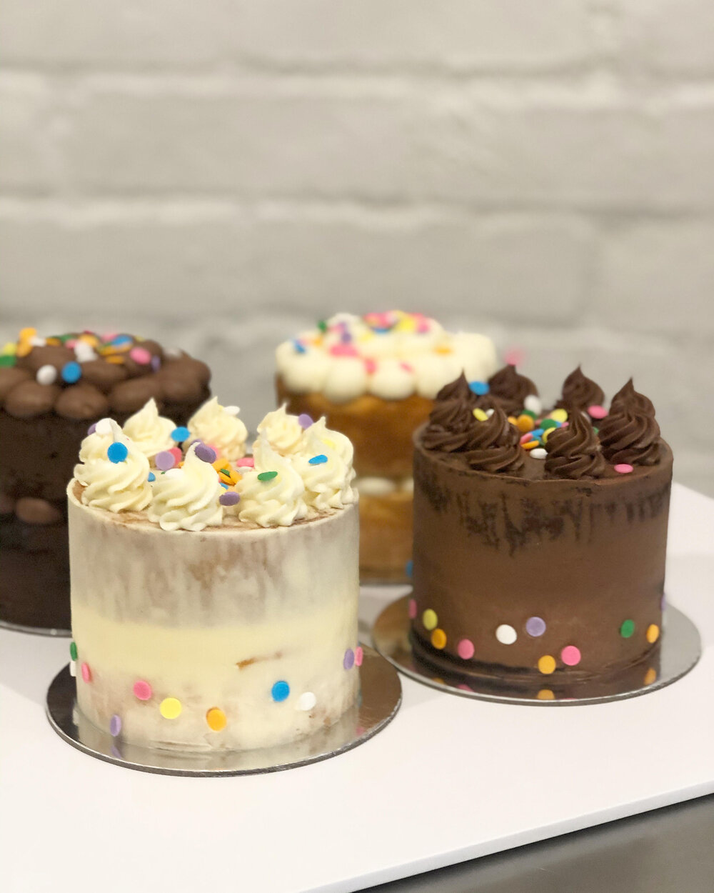 Slice the cake tops as they are equally levelled after which, cut each cake in half. Take white buttercream and pipe a ring around the edge of your bottom layer. Make sure to fill the centre! Add the second layer of cake on top and go along with the same technique. After frosting, refrigerate your cake for 15 minutes max. Add a thin layer of buttercream around the edges of the sponge cake, but seeing to that the sponge is a little peek through!