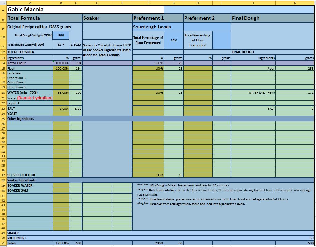 The spreadsheet below is a working example for a 500 gram dough. You could use this for a test. More Levain is not going to solve your problem. If you do decide to try this, make sure you document to process (write down times, etc) and take closeup pictures at important stages of the bake. For example, when you stop the BF, and things like temperature, etc..