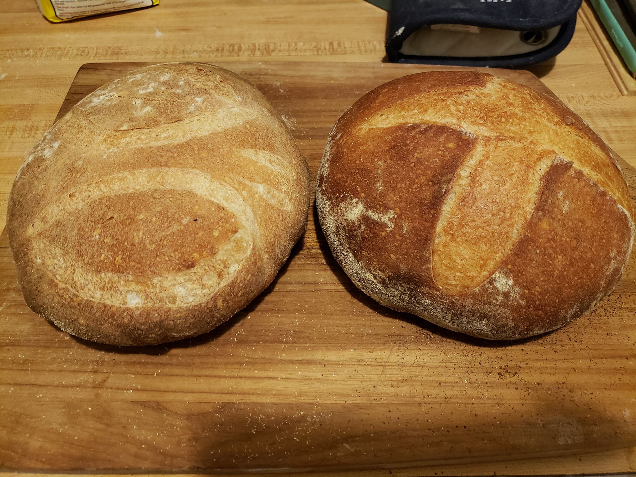 Below are my two final products. The one on the RIGHT was done in a Dutch oven, and you can tell because it picked up a nice color. The loaf on the LEFT I did on a baking stone in the same oven, spraying it in the early phases and (trying) to keep the oven damp. Judging by the paleness, I didn't get there. This has been a consistent problem with multiple loaves across recipes - I just get far better results from the Dutch oven method than trying to do this like you pros with a baking stone and spray bottle.