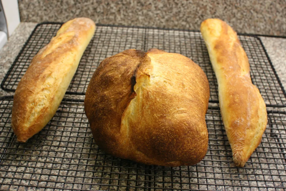 I ran into a bit of a timing snafu, no worries I cooled the jets on the the proof. now I am back. The oven is steaming while the loafs undergo a 30 minute room temperature proof. Just before baking the baguettes get slashed and the Altamura inspired loaf gets formed into a pompadour.
