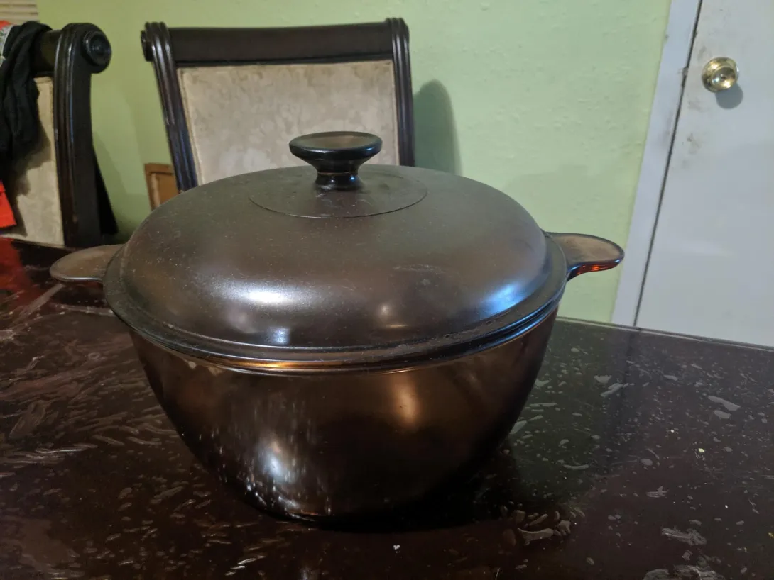 The pot has an engraving on it saying "VISION CORNING" and the lid says "Pyrex ®"