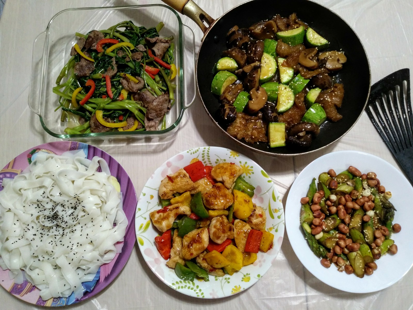 Braised fish maw, shitake mushrooms & zucchini, sweet & sour chicken, asparagus & peanut salad with black vinegar, stir fried beef, water spinach & bell peppers, served with broad rice noodles
