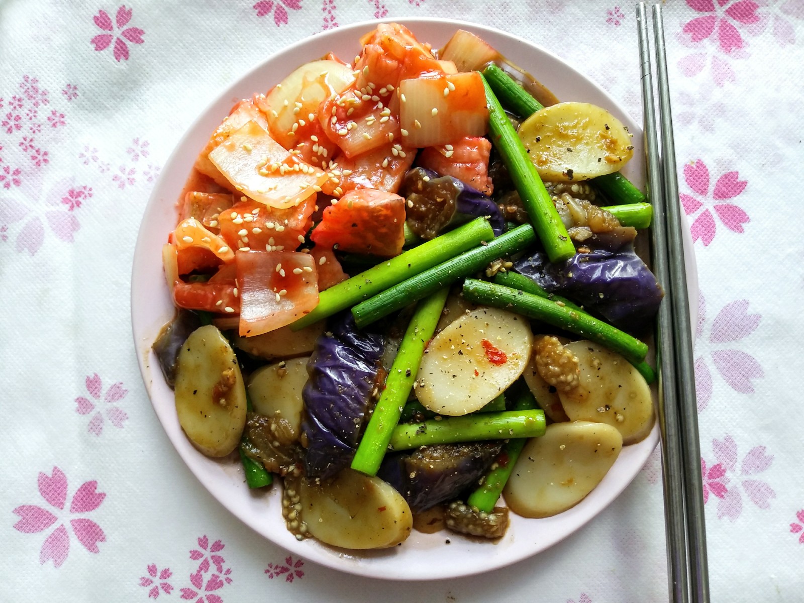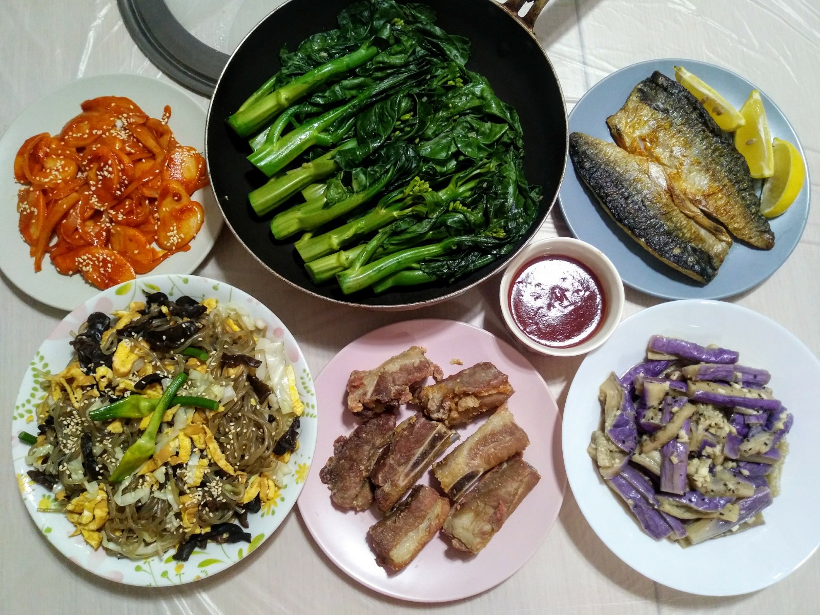 Fried ribs with a tangy dip, pan-fried mackerel, garlicky eggplant salad, Korean spicy rice cake, Japchae, and gingery Chinese broccoli