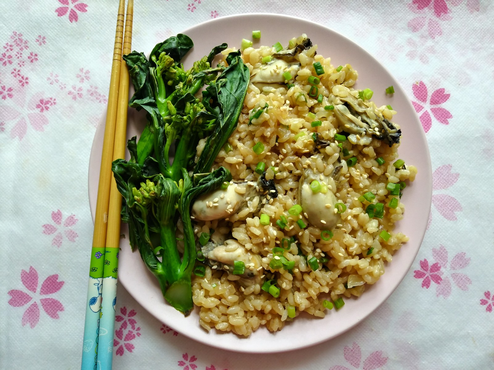 Stir fried sliced pork, garlic scape & wood ear mushrooms with onion egg fried rice
