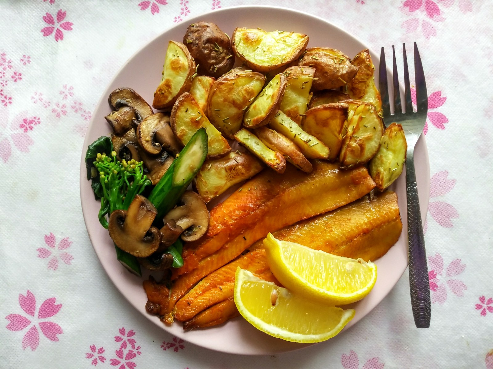 Kipper with rosemary roasted potatoes, and caramelized mushrooms and broccolini