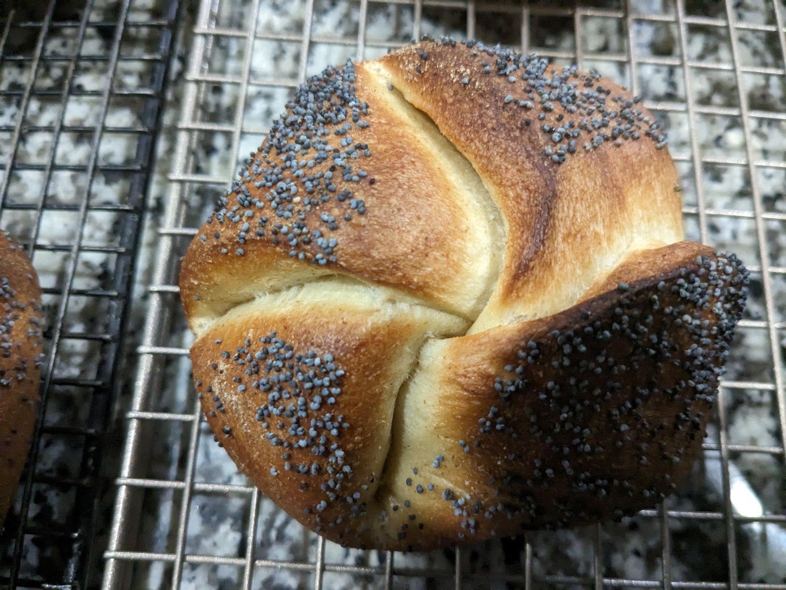 They are round with a crisp crust and a soft interior (not too airy). Sprinkled with poppy seeds.