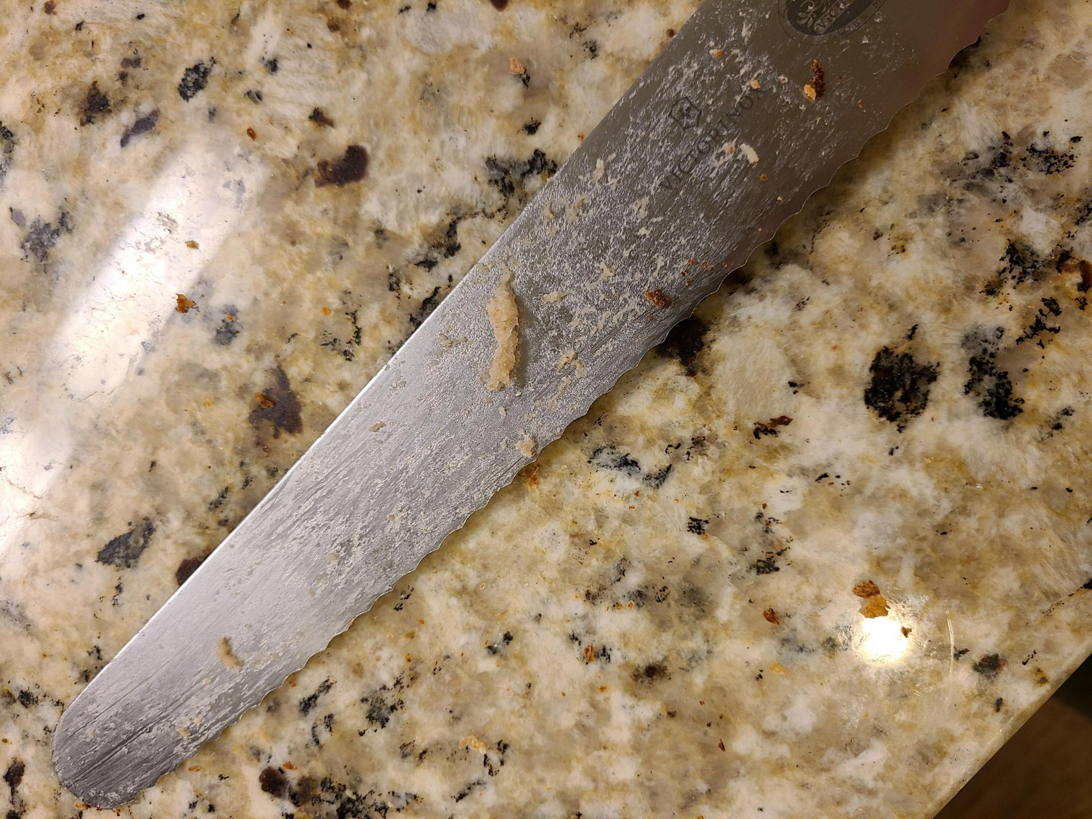 My bread comes out too sticky / moist (in some areas more than others). Just to give you an idea, this is what my bread knife looks like slicing into it 7 hours after taking it out of the oven: