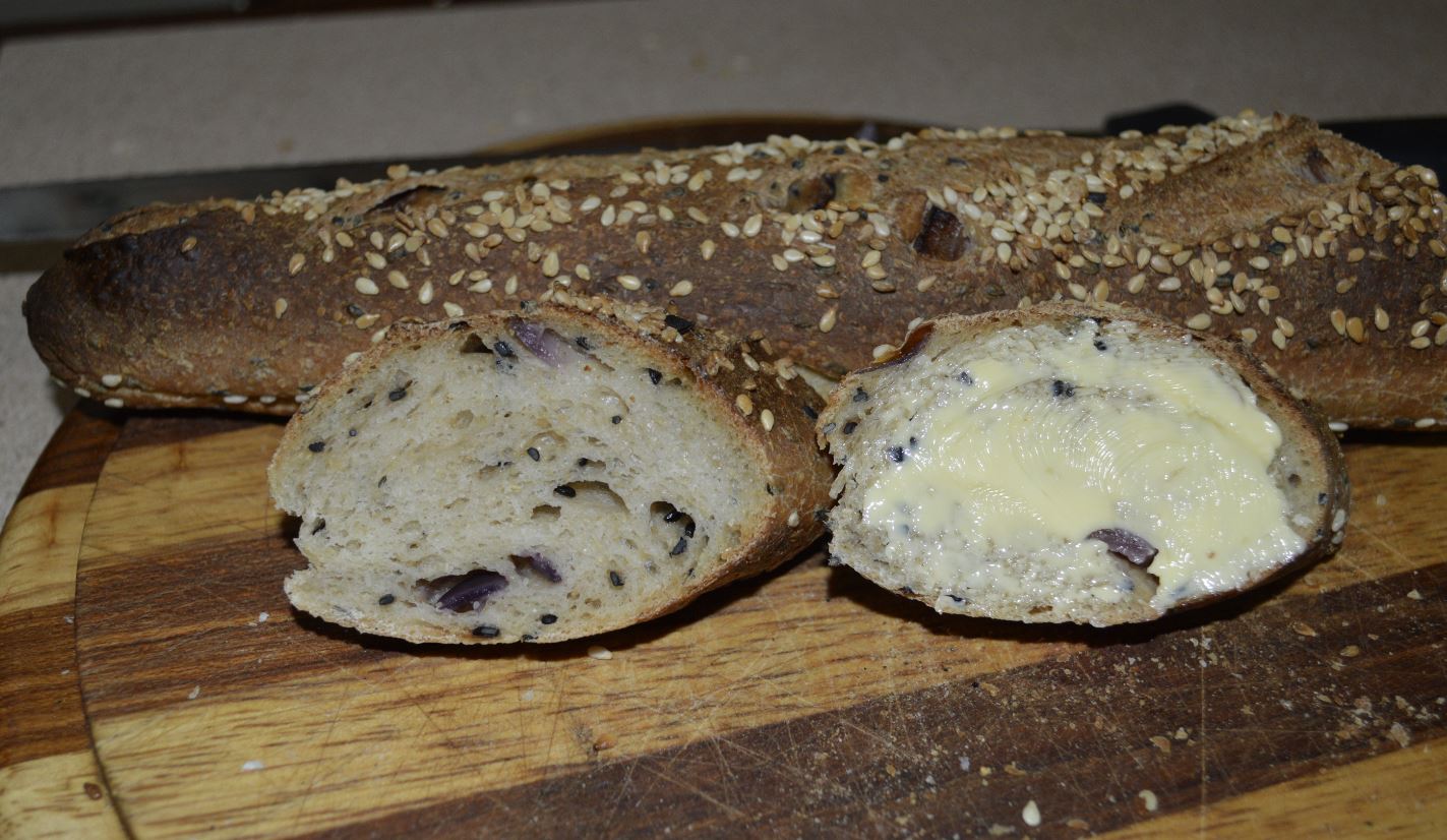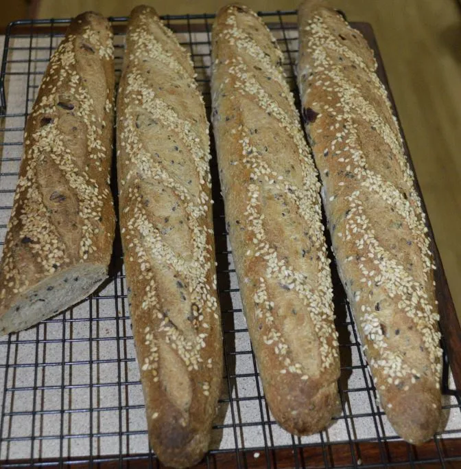 Following on from the good result that i had with the 50% W/M Raw Red Onion and Poppy Seed loaf  that i really enjoyed i had another go this time it was 50% W/M  Raw Red Onion with Black Sesame Seed S/D Baguettes Oh and i used full cream milk as well and again very very tasty indeed. Dough started at 8 this morning and  all don and dusted  at 8 in the evening.