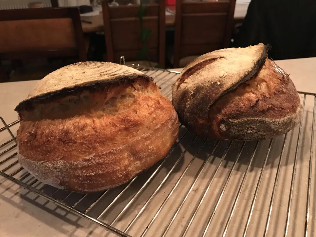 This is my second attempt. I’m happy with the oven spring but haven’t cut into it yet as I think I should let it cool (I read I should wait for 8 hours!). I have a question about bulk fermenting. I’ve been reading about the ‘science’ of sourdough and it’s all very interesting. There is one you tube chef who makes wonderful bread who puts his dough in a bulk fermenting container - ie after he has done all his folding and resting, so it’s already been a couple of hours since he added his levain to the mixture. Which is when I understand the fermenting begins. He then gauges when to stop his bull ferment when the dough has expanded by 25-50%. But this seems arbitrary to me as at least a couple of hours fermenting has already taken place. I saw someone else on you tube who puts a small amount of dough in a tiny pot right after incorporating the levain into the dough, and bulk fermenting is complete when it’s doubled in size. Which for me is a better method (if it’s an accurate method) as my kitchen is quite cold in winter and very hot in summer so fermenting ‘times’ might be a bit hit and miss. Any advice on assessing fermenting times would be most welcome. Also, I prefer a darker loaf...have I overdone it here?