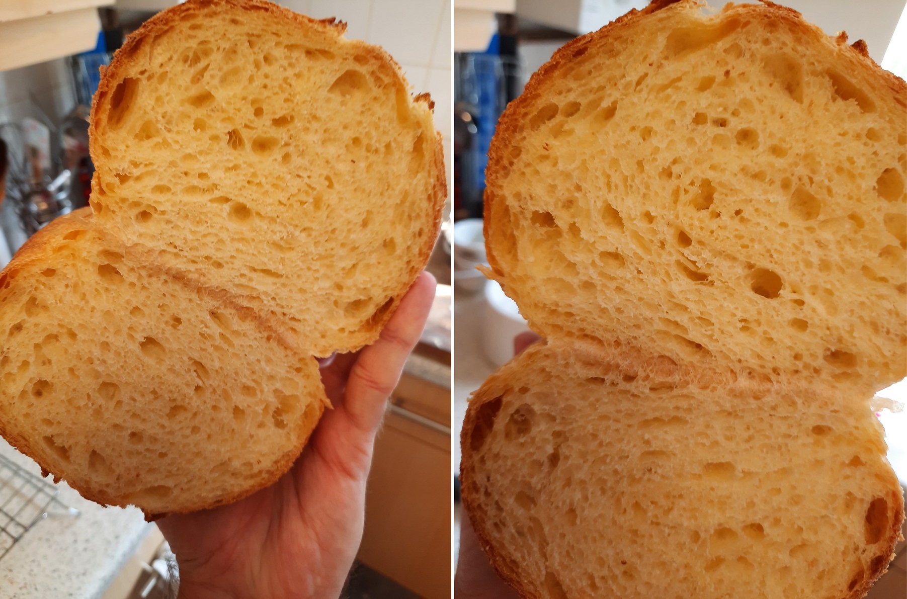 The crust is light / delicate (thin) since the loaf is low density, just as I like and as with all my bakes the crumb is very, very soft, although durum brings a touch of coarseness to the overall texture. Good chew but light and delicate if that makes sense...
