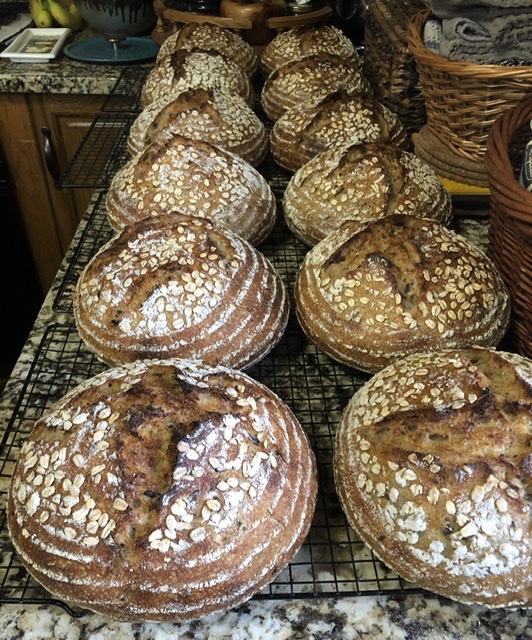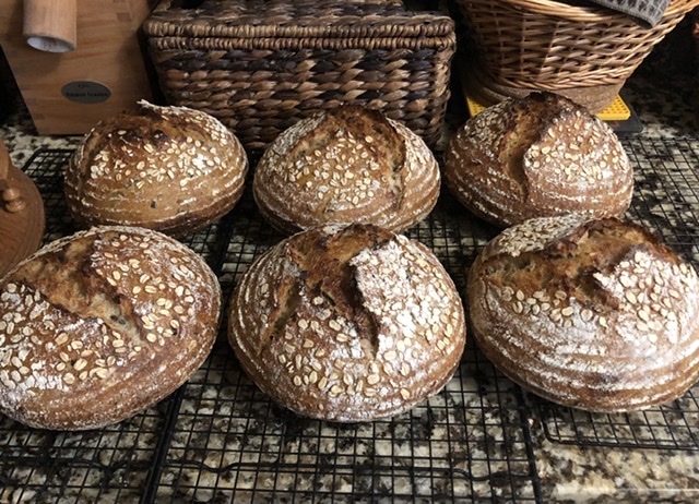 12. Sprinkle barley and oats flakes in the bannetons. Place the dough seam side down in the bannetons and cover. Let rest for a few minutes on the counter and then put to bed in a cold (38F) fridge until the next morning.