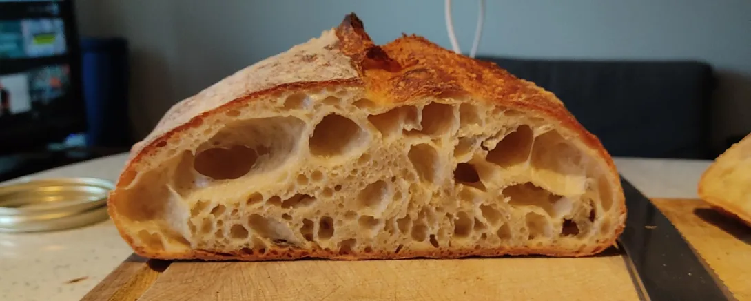 This time. 11 hours bulk, 23-24 degrees dough temp. Just over X2 in size. I watched it throughout the day. Again, nice straightforward shaping. 45min proof, turned it out and pancaked again as before, struggled to score. The photo is the crumb this time round.