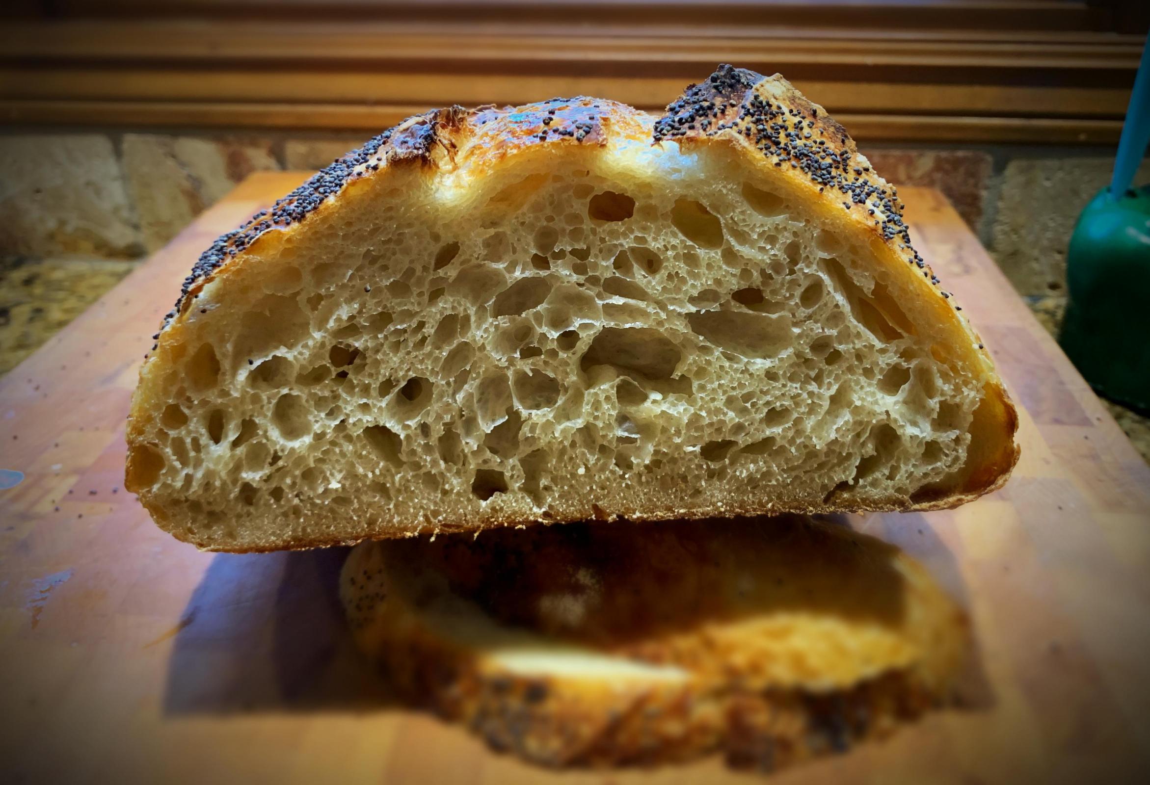 This is looking promising. I made a tangzhong with 25 gr flour and 125 gr of milk. Added the pre-ferment and then the flour. Waited a bit and then added the salt. I tried for 60% in bulk but it got away from me. Doubled and then into the fridge for 18 hours , baked in a dutch oven at 450 after spraying with water and a sprinkling of poppy seeds.
