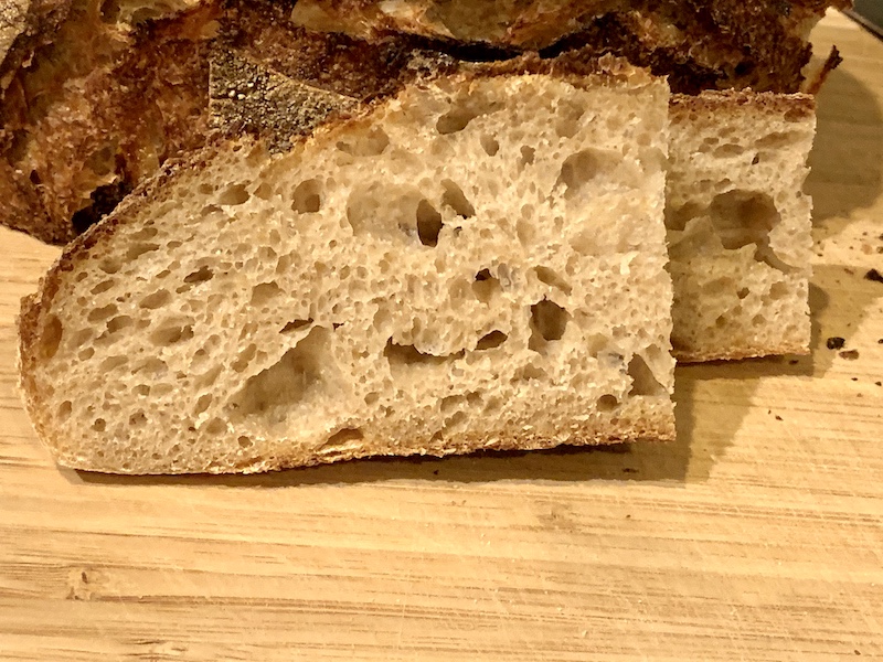 Here is a photo of the crumb of yesterday's bake - Forkish's "Field Blend #2" My only modification was to substitute Spelt for some of the rye. I did 2 stretch and folds in the bowl at 30 and 60 minutes and one lamination fold at 120 minutes into bulk fermentation. BF was about 3 hours. I proofed at room temp. for 50 minutes, then cold retarded for about 20 hours. Let the loaf warm for an hour while the oven was being used otherwise and baked per Forkish in a Dutch oven.