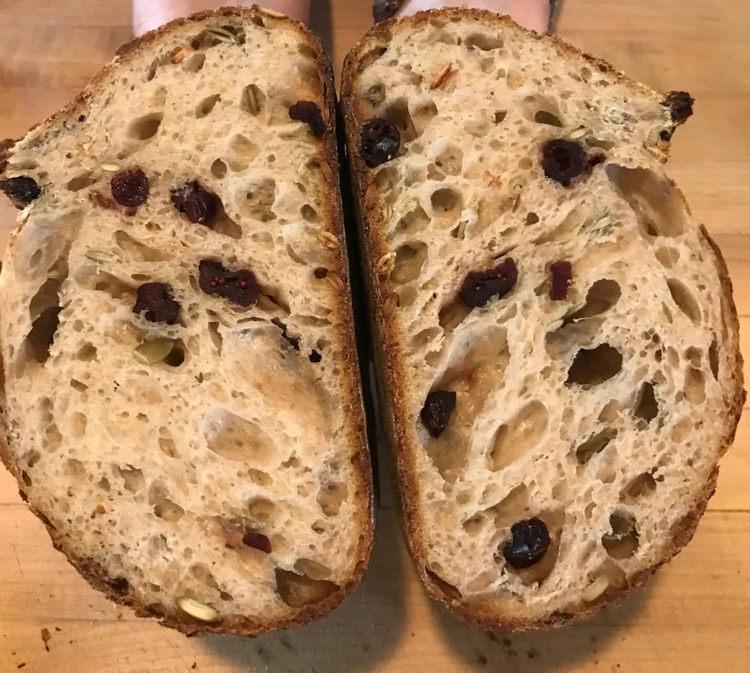 The recipe is 80% bread flour, 20% spelt(milled and sifted at home) 75% water 10% fermented flour. 20% Craisins and 10% sprouted pumpkin seeds 2% salt.