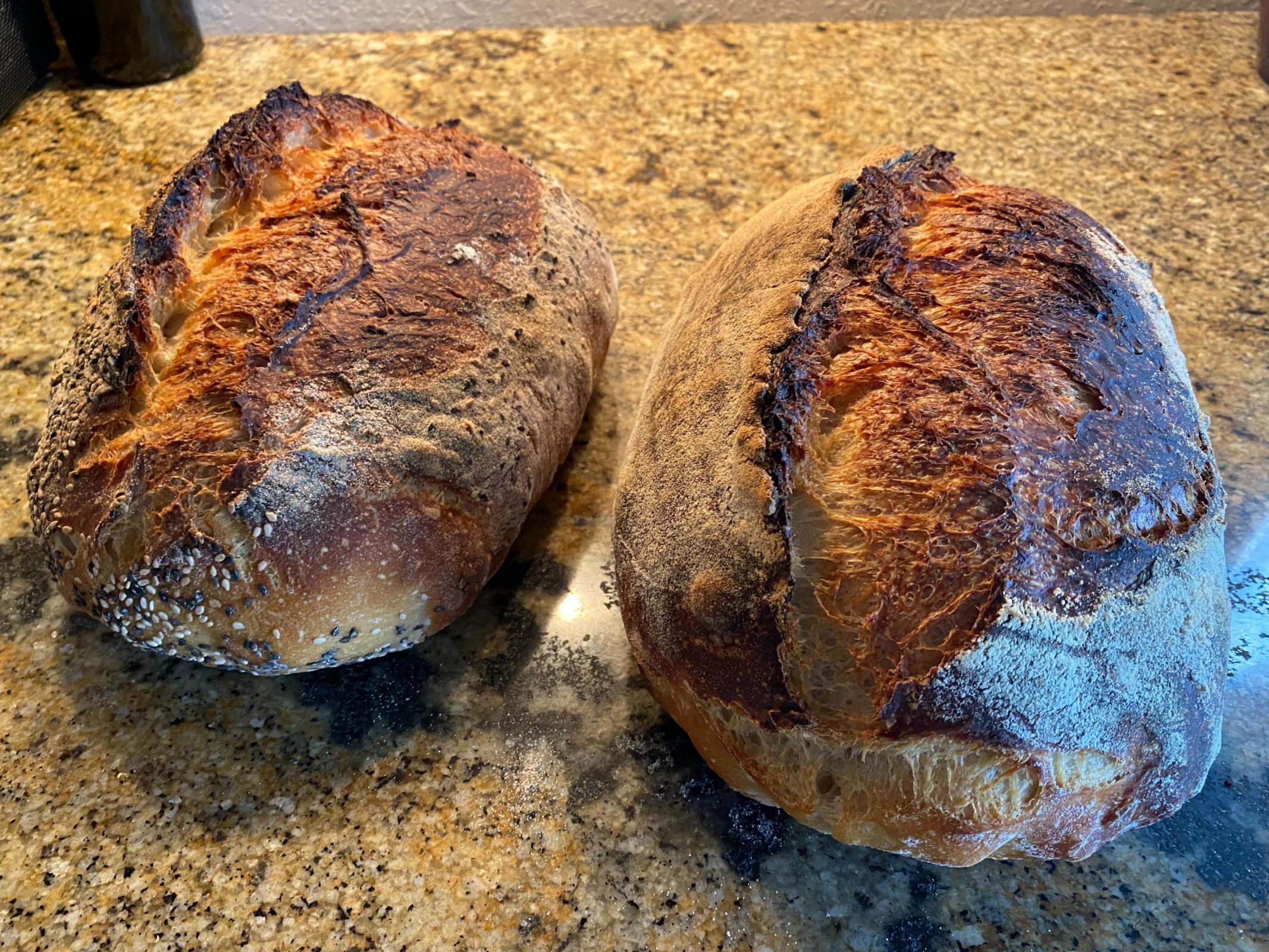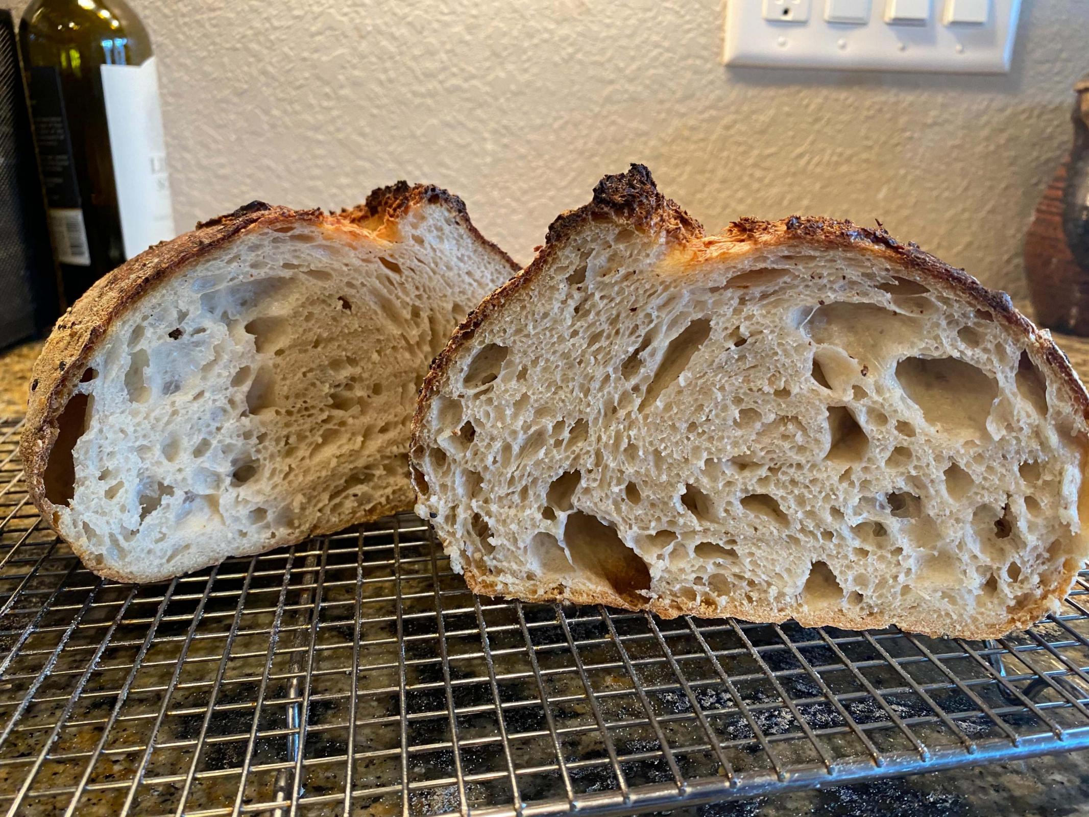 I did stretch and folds every 30 to 40 minutes for about 3 hours. When I felt that the dough was puffing up and getting stronger, I put it into the refrigerator overnight in the main bowl. I did not shape the loaves yet. I did not see a big difference in the bulk rise taking it out of the refrigerator. It rose a little but not significantly. I left it on the counter to warm, and detected some more activity fairly soon after, but I was pressed for time and I may have shaped my loaves too early? I am wondering just how much importance the bulk fermentation has before loaf formation? The loaves themselves looked as close as I have seen to being proofed properly and ready to bake. This is a 75% hydration recipe. I don't think that is too much water. I keep wondering if the bread was underproofed. My starter is very strong and very active. I don't think it is the fault of the starter. I am looking at the hole formation and it looks a bit uneven to me. But the spring is there. I am wondering if what I am seeing is an underproofing issue and not an overproofing issue or a baking issue. Any opinions on this theory?