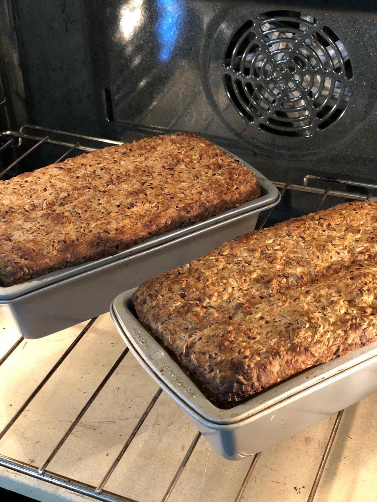 You might want to wait longer to decide if it is too wet.  Instead of reducing ground flax, try increasing the ground flax or reduce the water by a tablespoon (17 - 20g per loaf.  Or let the bread cool upside down on the rack or as suggested depan and bake 10 min longer. Or toss in 20g dried rye bread crmbs (perferably the crust) or 10g dry roasted oat flakes per loaf.   I smell grilled chicken.  Gotta run.  :)