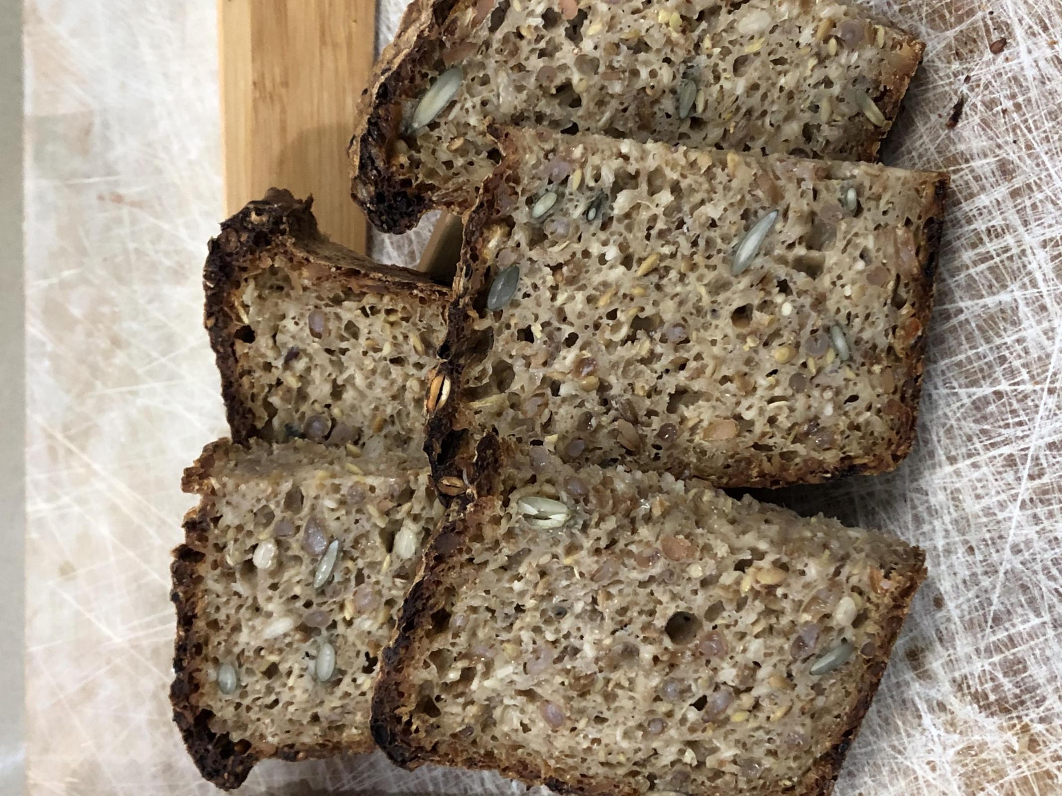 I have made this recipe a few times with similar results. It's a hearty winter season favorite with butter or an open face sandwhich. I baked it in a long pullman pan which being narrow helps to dry out the inside. You could take it out of the pan and leave it in the oven to dry as it cools. The texture and flavor improved over time and the bread kept well wrapped in plastic for almost two weeks. It does freeze well and the birds really loved what I couldn't finish.