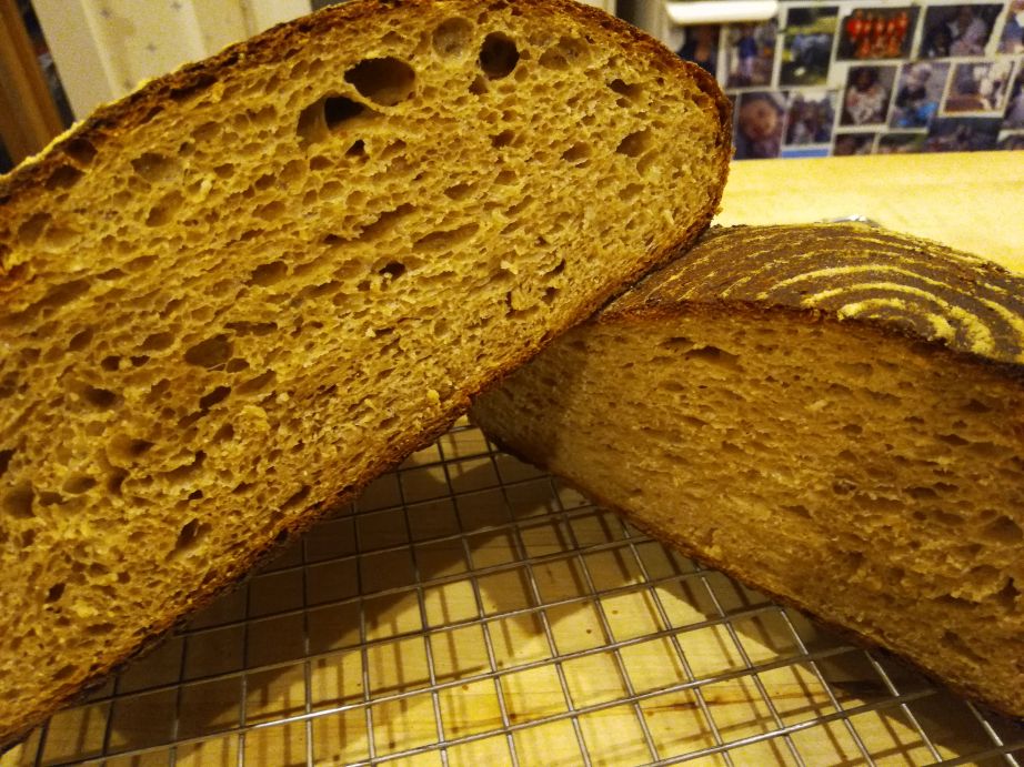 - Looking at the crumb, there tends to be slightly bigger holes on top than bottom. I think this is a sign that I slightly overproofed the dough. I am going to try less proofing for next bake.