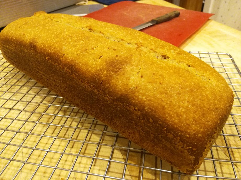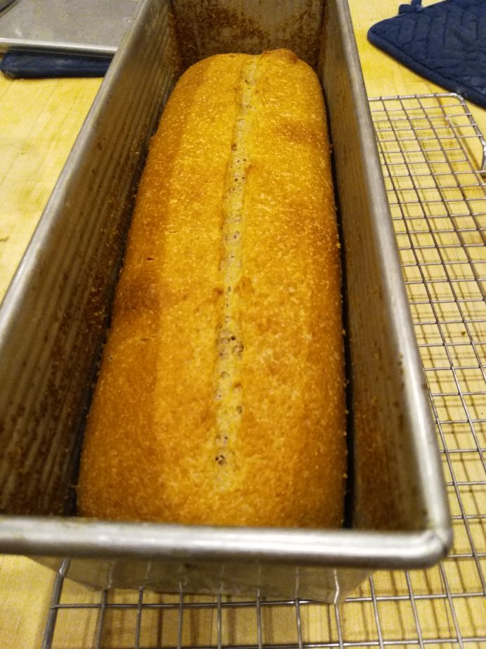 - 8:25p: Pull from oven, transfer loaf to rack. Let rest until cool, probably 2.5 hours.
