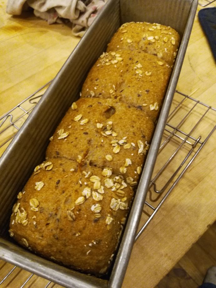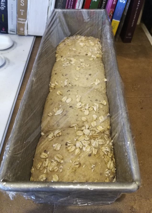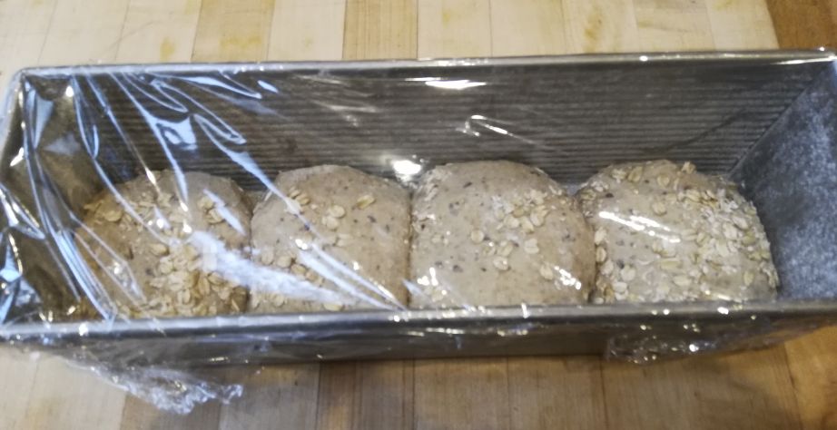 - 11:05a: Shape dough and load into pan, roll tops into oats on bench, seem sides facing inwards?