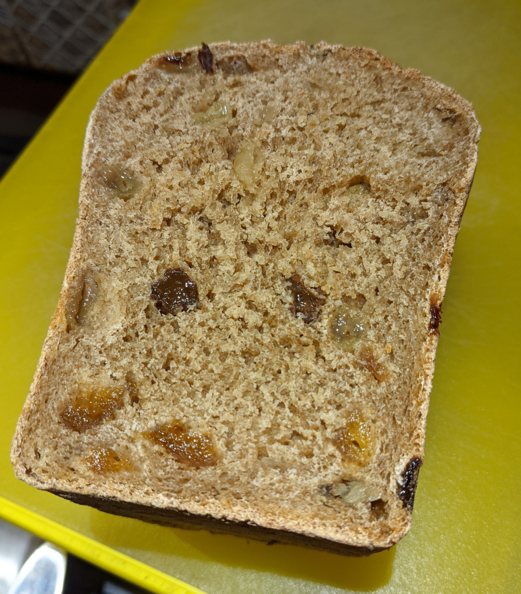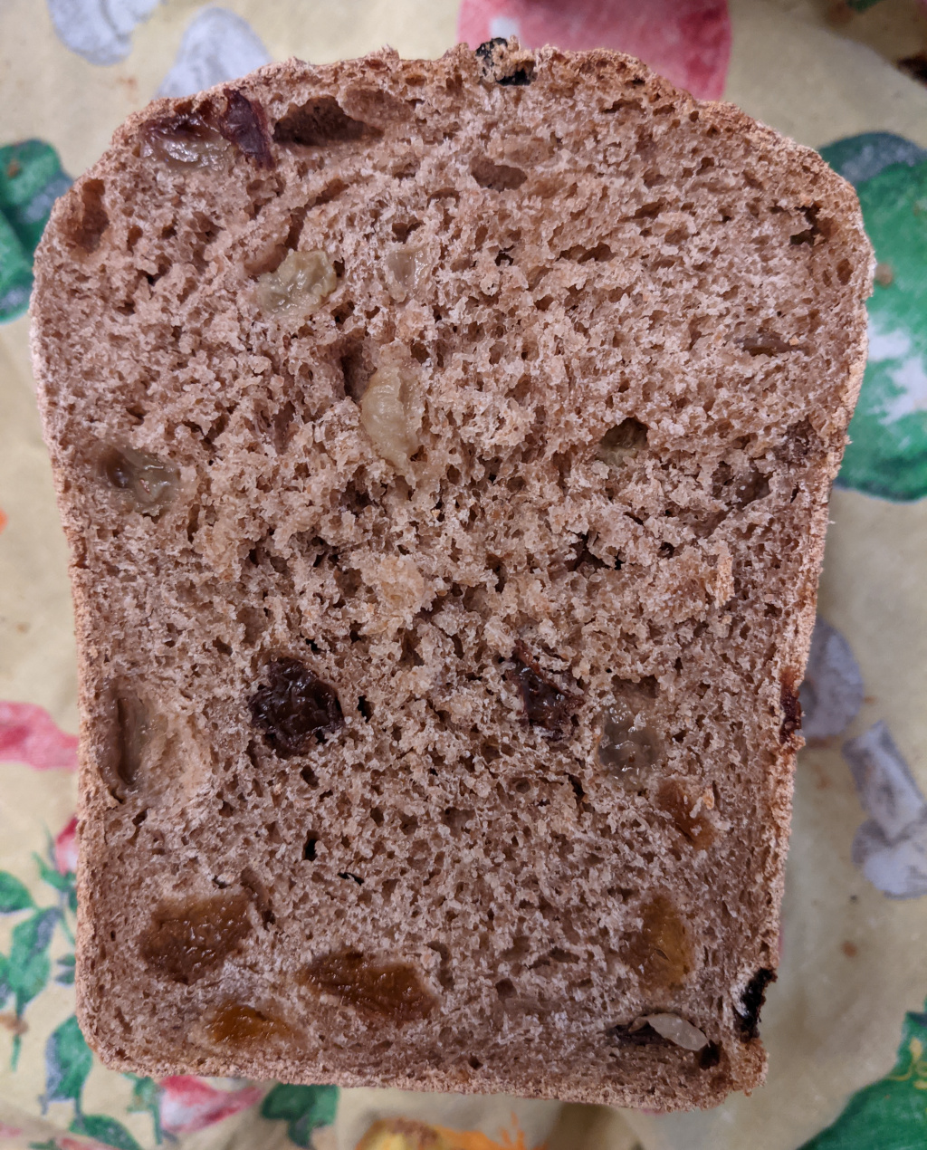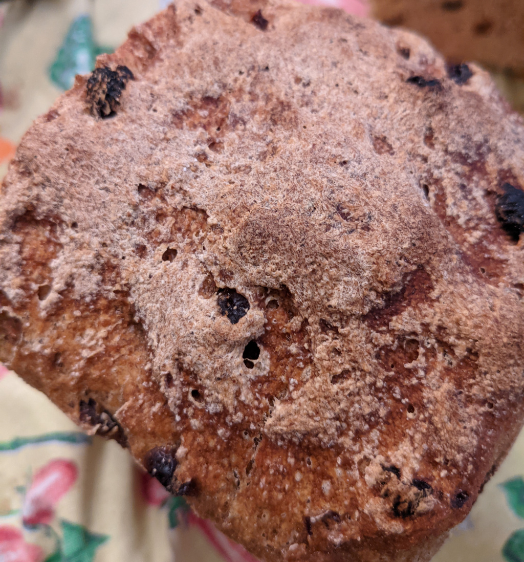 Baked a raisin bread with a one-pass stone-ground, high-extraction bread flour from hard red wheat. I used a multi-stage recipe that starts with scalding with diastatic rye malt, then fermentation of the scald with LAB starter and bakers yeast, followed by pre-dough with more yeast and then final dough. Final dough and proofing only took about 2.5 hrs.