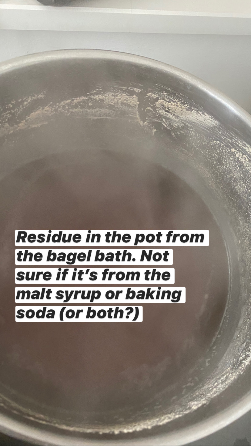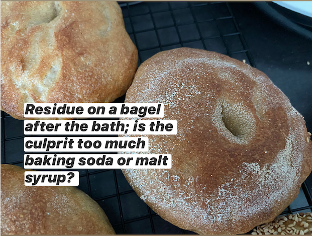 2. Residue on the bagels (and in the pot). Today for nearly 3 quarts (2600ml) of water, I mixed in 14 grams (1 tablespoon) of baking soda and 12 grams of pure malt extract syrup. The pot and some of the bagels had this white residue on it (I'm guessing it's from too much baking soda?) How much would you recommend? I did an egg wash on some of the bagels and the residue went away, but I'd like to understand why that's happening.