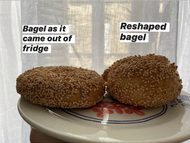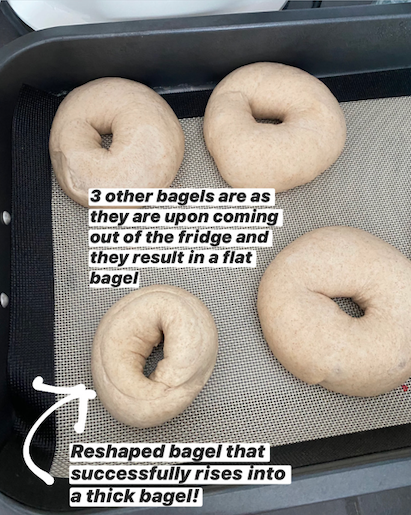 1. Flat bagels unless I reshape them: I have been making and shaping my bagels then proofing overnight for 24 hours in the fridge. Upon taking them out (and prior to boiling and baking), I have found that I must reshape the bagels in order to get a good, thick rise. (I am going for a very thick + chewy NY style bagel!) If I don't and leave them as they are, they come out flat. When I reshape the bagel and reshaping it into a log, there is quite a lot of bubbles/gas that pop as I reshape it. Does this suggest I should be using less yeast? I am currently using 5 grams of instant yeast for 1000 grams of flour. It's a 51% hydration dough.