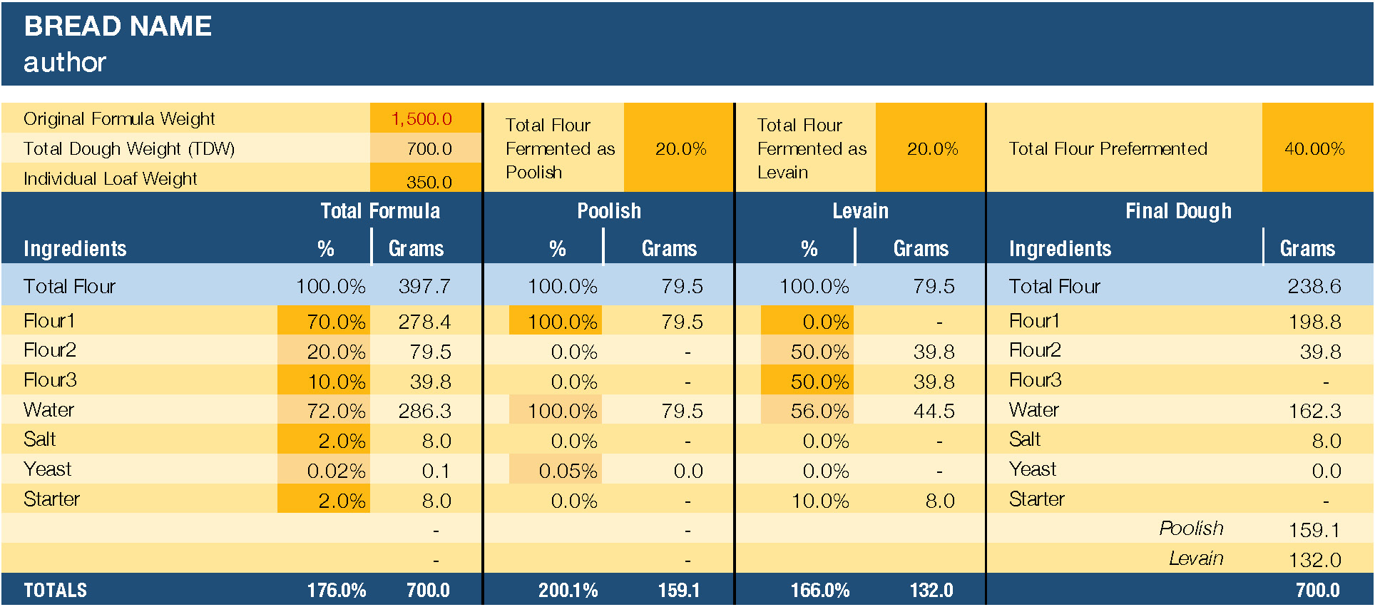 For years, I have had all my bread formulas set up in an elegant little app called BreadStorm. Regrettably, it is no longer supported by the developers and, while it still works for now, that could change at any time. I am in the process of converting all my formulas to spreadsheets using the BBGA format as my model, but I have a question about the formatting of the spreadsheet, which is this: Is it possible to scale the formula by changing the Total Dough Weight (TDW), or can it only be done by changing the total flour weight in the light blue field?