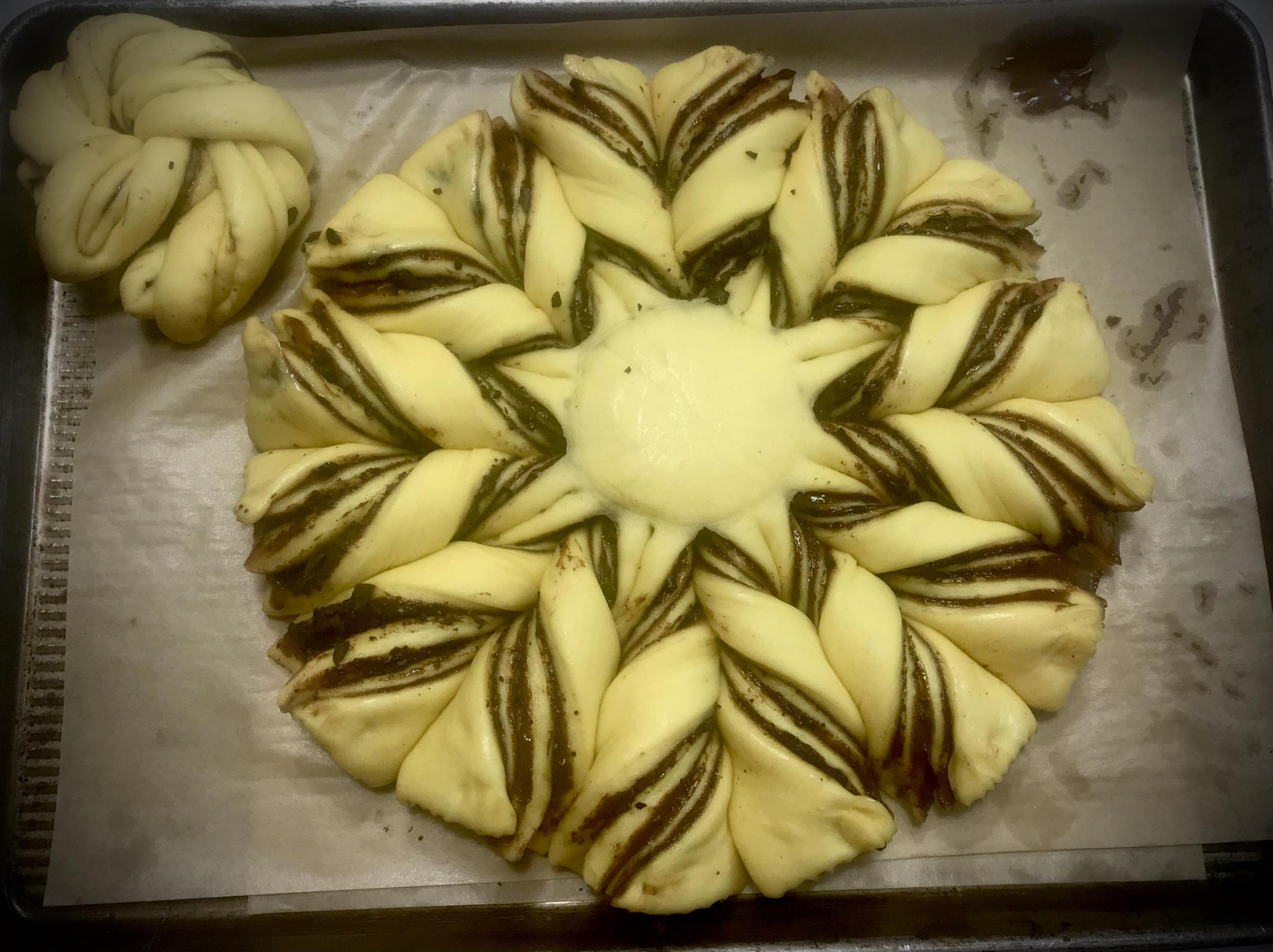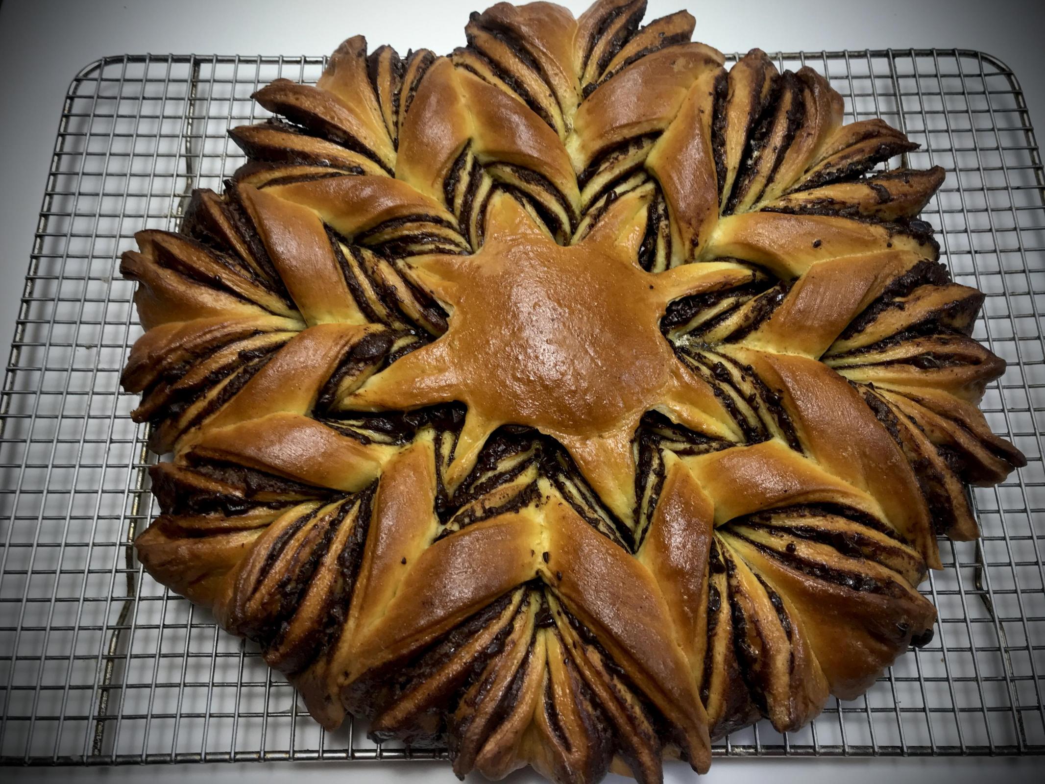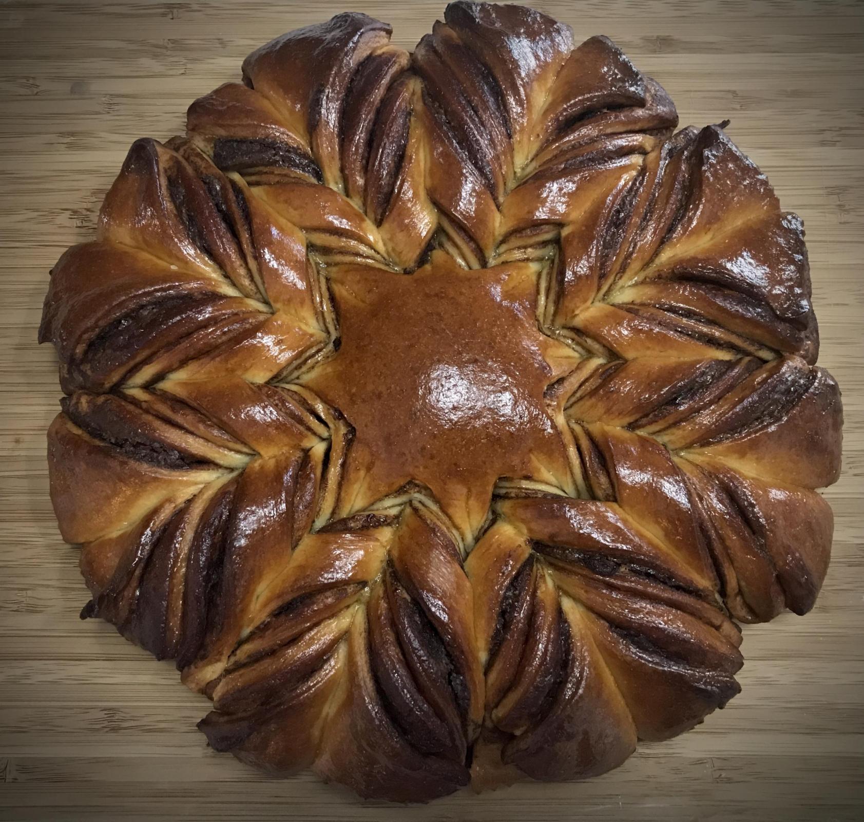 A note about the image below. Compare the image at the very top of the post with the one below. Notice how the interior star is not as nice as the star in the top image. The reason being, the dough in the bottom image was cold from refrigeration. The dough layers in the top image were room temp when twisted. The cold dough does not twist as well. Next time the dough circles will be refrigerated to facilitate ease of handling, but once the bread is assembled with Nutella and chopped chocolate, it will be allowed to warm some before the twist shaping. Viewing this YouTube video will be helpful to learning the shaping procedure. Note - I didn't use the formula in the linked YouTube video. It is not as difficult as it looks.
