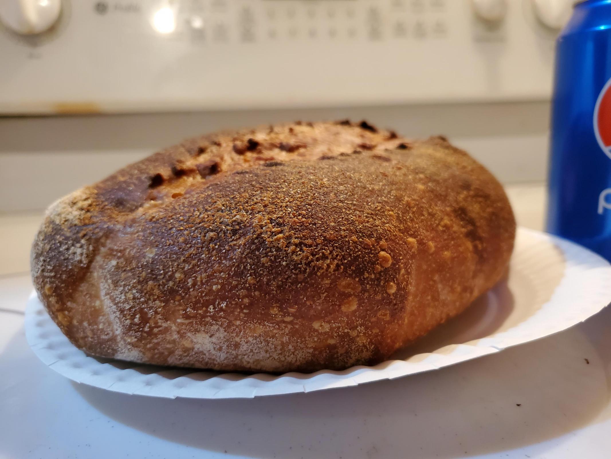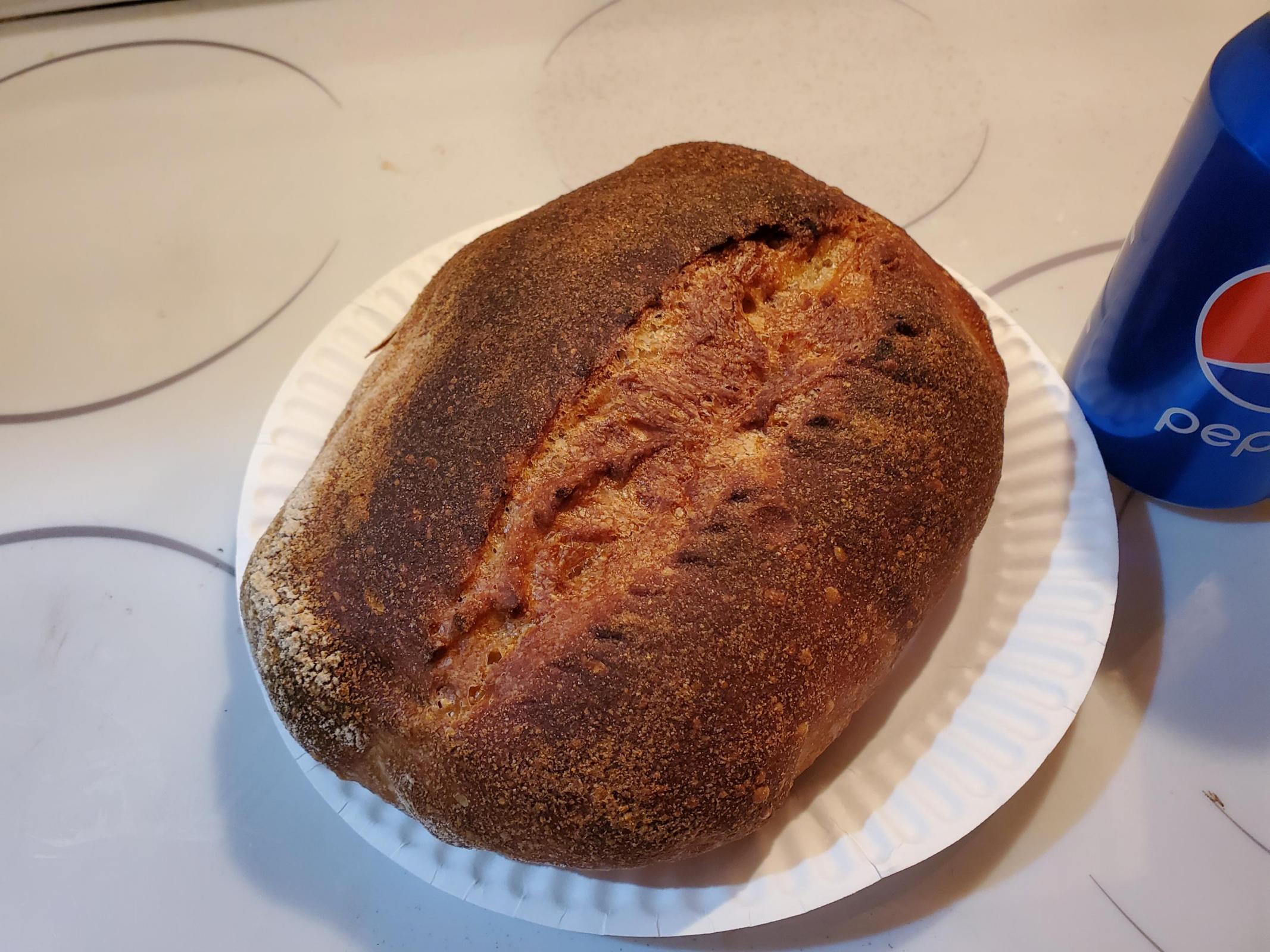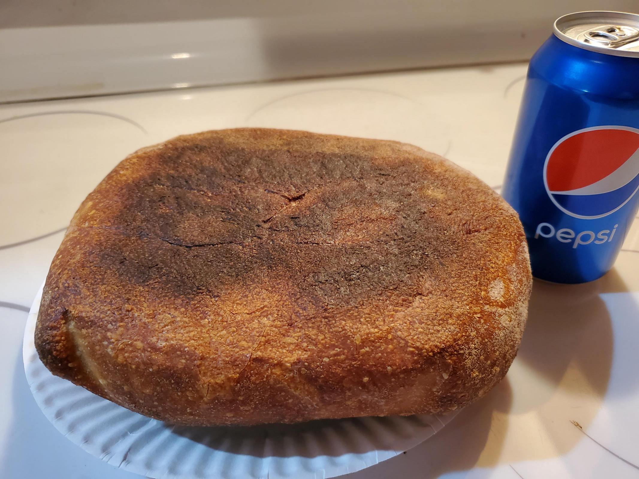This was proofed in a loaf pan and baked in a Dutch oven to 99°C (211°F). You can see some burning, especially on the bottom. The was proofed in the pan under a towel to be faithful to the recipe. I had some drying on top that I think gave the flyaway crust.