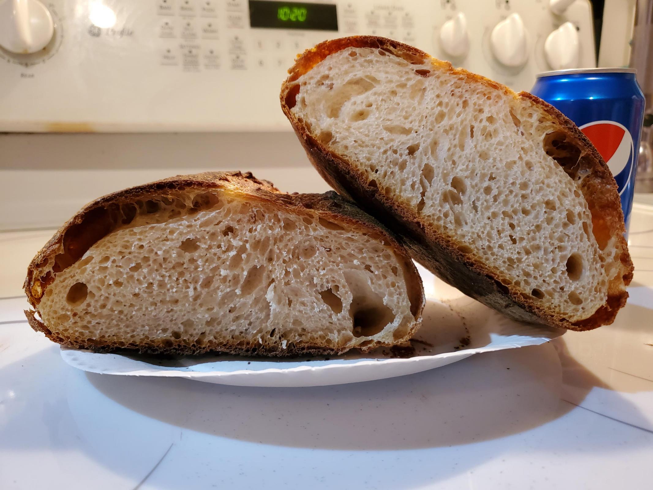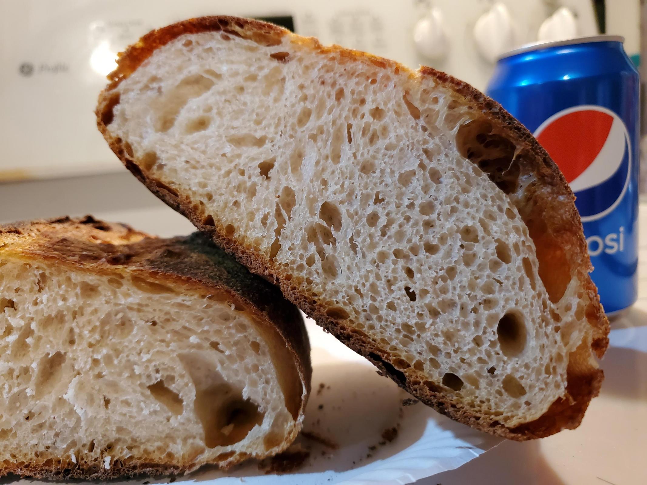 I'm not quite sure this is over-proofed even though it's on the flat side and there is a fair bit of crust separating from the crumb. I actually thought I could get more proof time out of this but my wife wanted me to get to sleep.