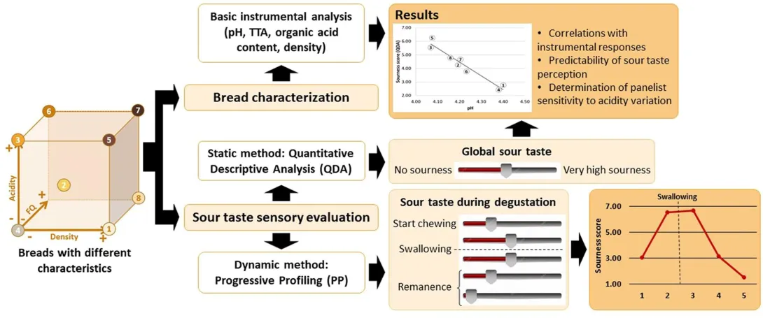 The sour taste of breads obtained as described previously was evaluated by two types of sensory analysis: Progressive Profiling (PP) and Quantitative Descriptive Analysis (QDA). A panel of 15 healthy volunteers (10 women and 5 men, aged between 23 and 62) was recruited based on their motivation and discrimination abilities