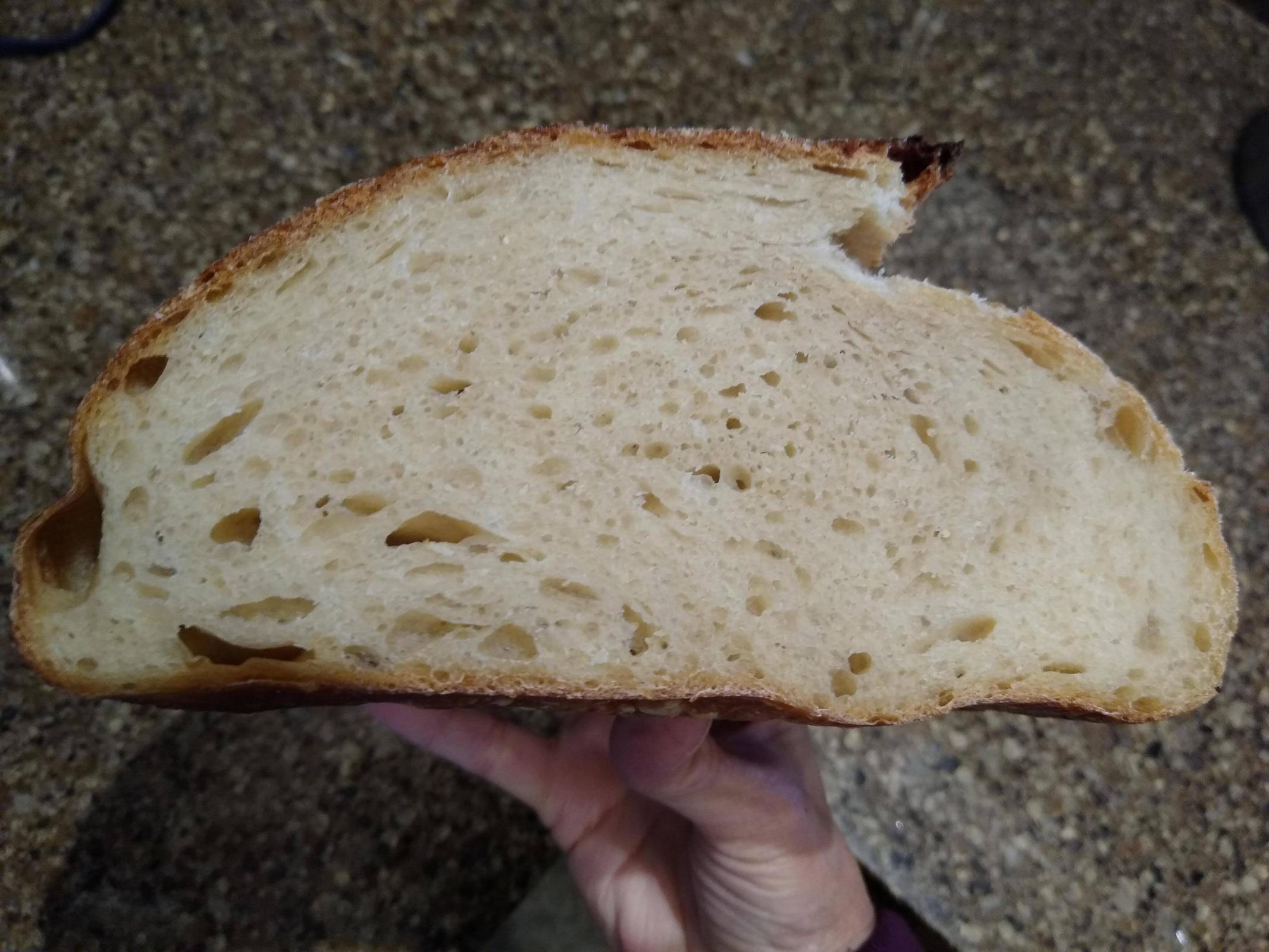 A pleasant bread for pairing with soup today. It has a thin, still crisp crust and nice chew, and barely any tang. And the accidental reduction of salt (which wasn't much) didn't seem to be an issue.