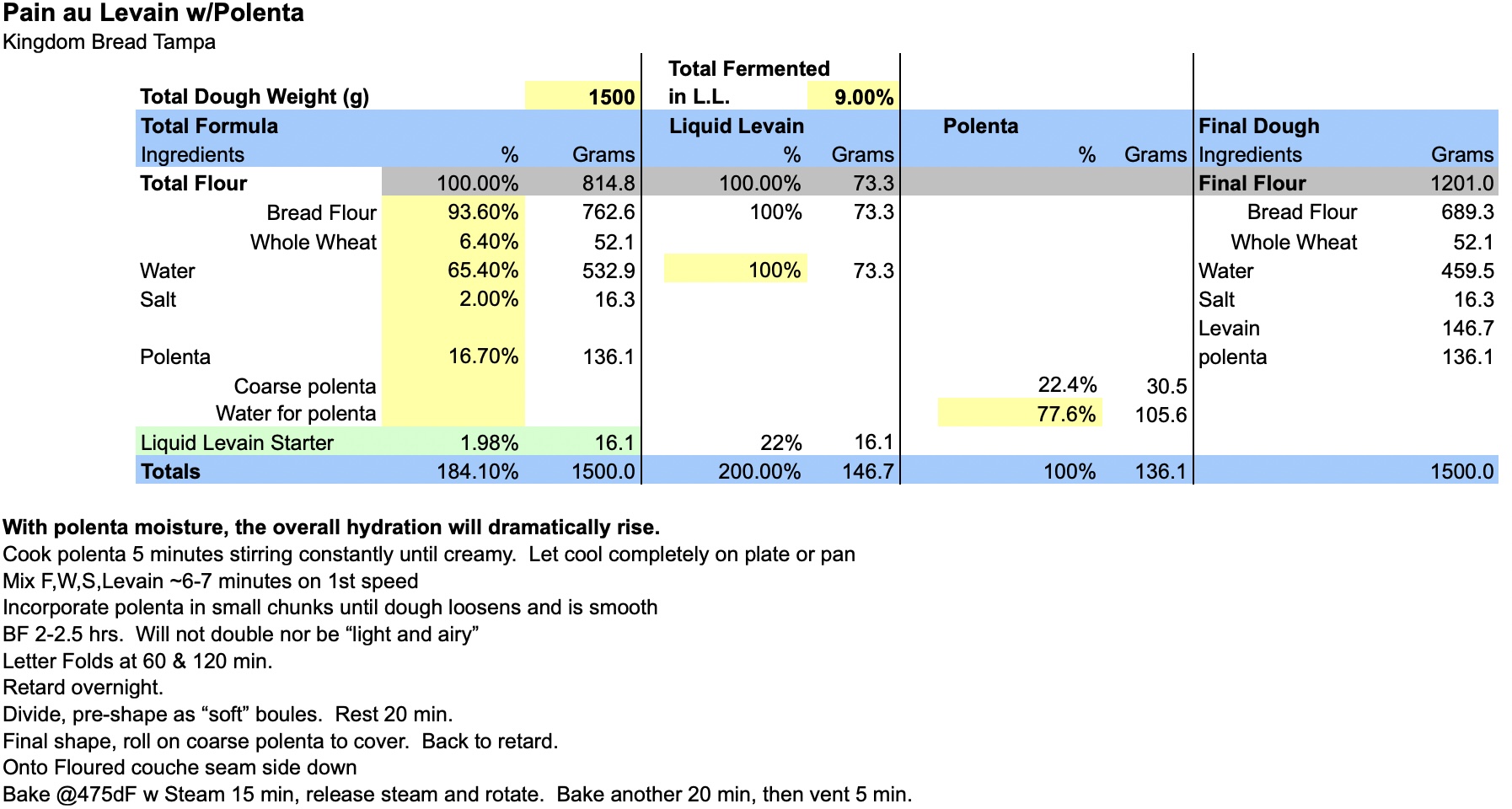 The video amounts/percentages almost made me pull my hair out. Adding up the posted amounts of ingredients from the video, it comes to 3301g, which is right on as he's calling out 825g x 4 loaves. Then he says the polenta is 10% of the dough weight - 300g! 20% levain? Does that mean total dough weight, percent of total flour, or PFF of the total flour.