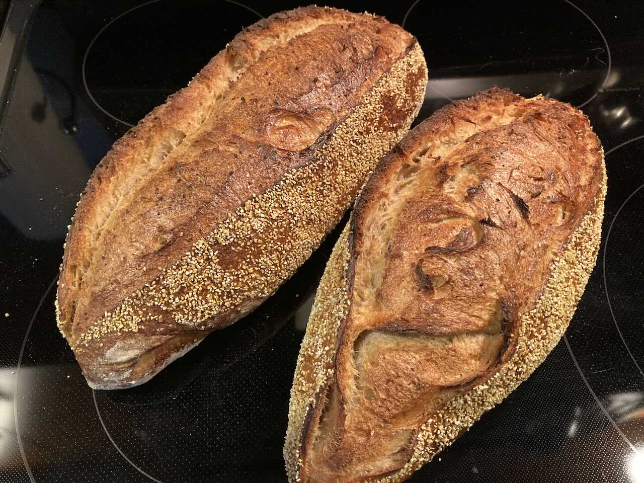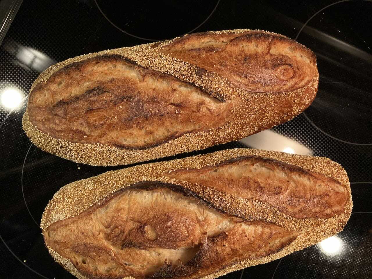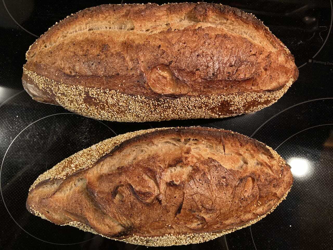 Both were shaped this morning and sent back to retard once more. The second batch was less sticky and easier to shape. 2 consecutive bakes as these are too large to place all 4 across my oven deck.