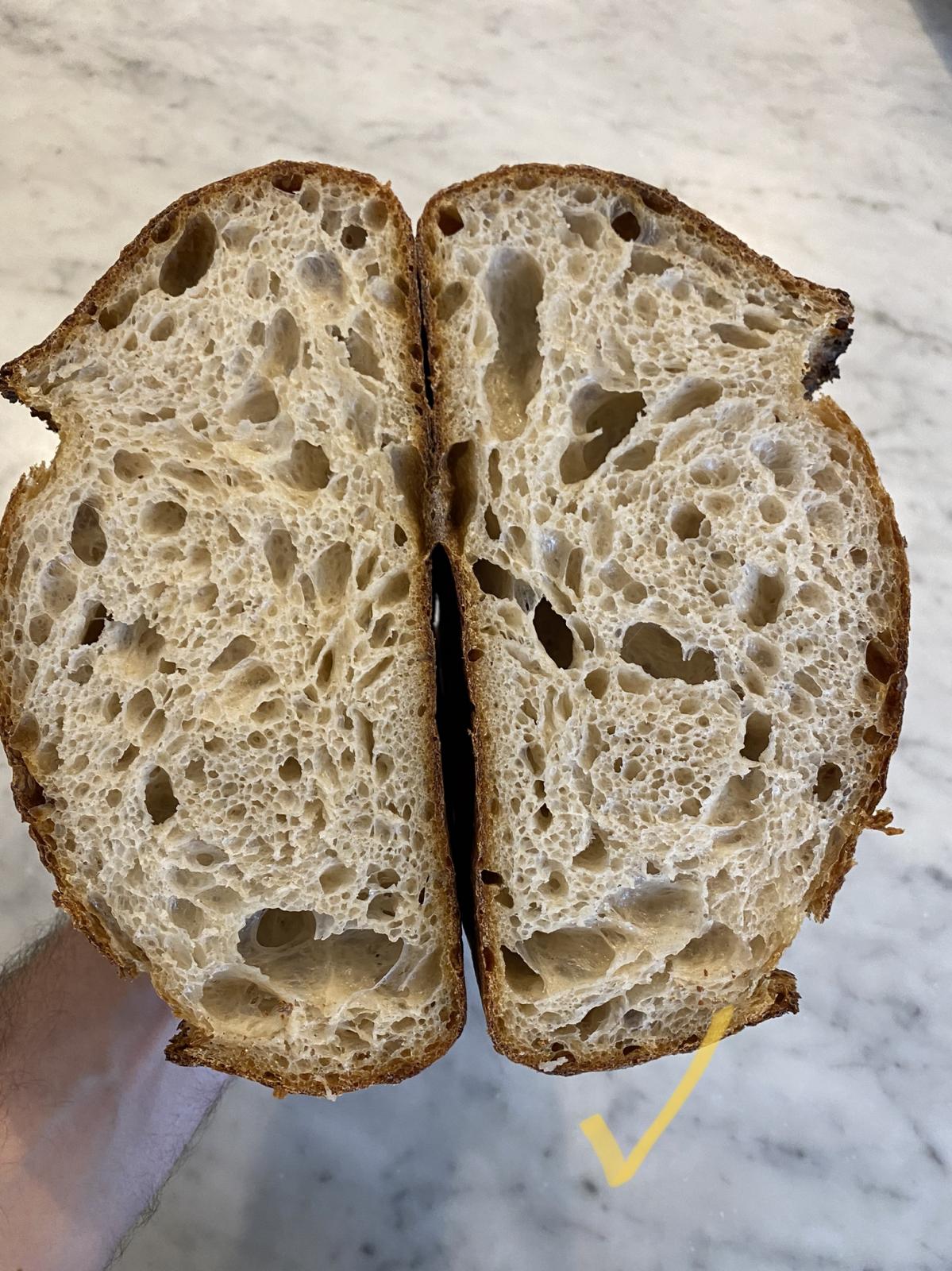 Hi all -- Overdue for a proper update on recent bread experiments (there have been many this year, from so much time at home!). But before that, wanted to see if others might be able to help me figure out an occasional problem I see with some sourdough loaves. Specifically, every 15-20 or so loaves (e.g. infrequent, but not completely one-off), I tend to see a thin layer or layers of only partially cooked/gummy crumb near the bottom of a loaf when I cut it open. It's really hard to predict when this will happen until I cut into the loaf, and I'm pretty consistent with my process, cooking time, etc, so I haven't been able to predict when it will happen. My current theory is that it is caused by something I'm doing in the shaping process, potentially when I "cinch up" the batard, which can sometimes get a little messy/thick and layered, so I wonder if I'm unintentionally creating some lamination at the bottom of the loaf which causes the gumminess. I'll attach some photos of a normal/good loaf, one with slight gumminess, and one with egregious example, for reference.