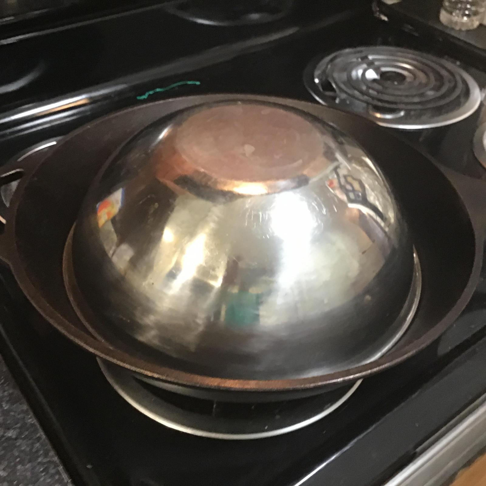 I used a 15" Lodge cast iron skillet. 15" is the outer diameter at the upper rim. It has a 12-1/4" inside diameter at the inside bottom. I bought it new on Amazon when it was on sale for $40, including shipping. https://www.amazon.com/Lodge-L14SK3-Skillet-Cast-Black/dp/B00063RWUM?tag=froglallabout-20