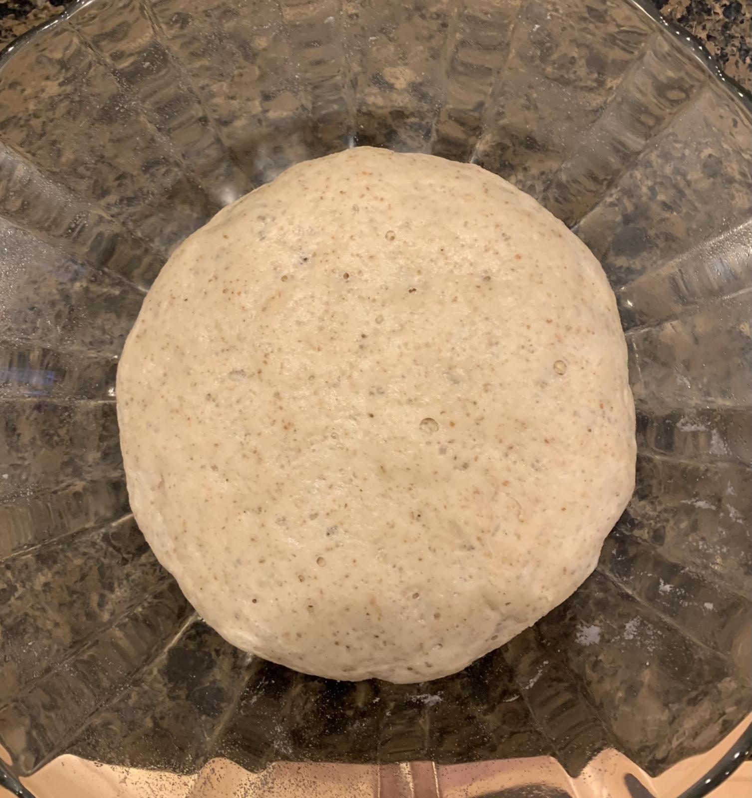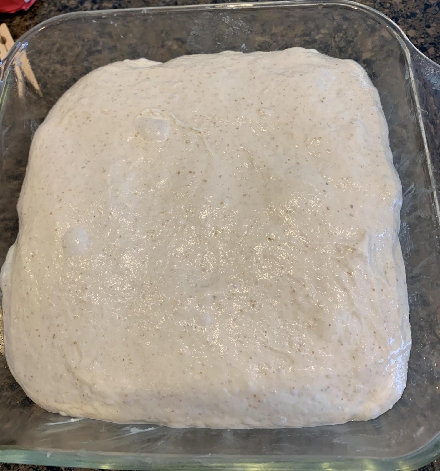 Did folds every 20 minutes per the method.  I used coil folds to minimize handling the sticky dough.  I do my bulk in a lightweight plastic bowl, and the bowl kept lifting with the dough.  After the third fumbling with the bowl while trying to fold, I transferred the dough to a Pyrex baking dish.  That worked much better.