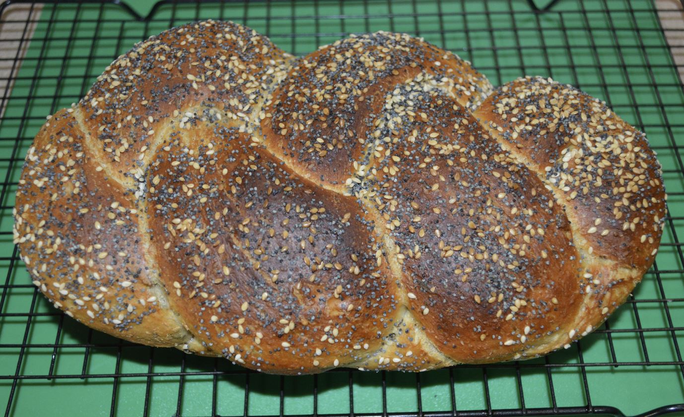 The dough was taken handed up and given 10 minutes rest before dividing into four pieces rolled out and plaited i lined the cold Romertoph with baking paper and placed the plait in there to proof inside a plastic bag and for the first time i soaked the Romertoph lid. at 3/4 proof i washed the top of the dough piece with a boiled cornflour  paste wash and sprinkled a mixture of poppy and white sesame seeds. i had the gas oven  up to   500 C as the Romertoph was going in room temp. i kept the lid on and the temp up for the first 15 minutes then removed the lid for the completion of the bake.